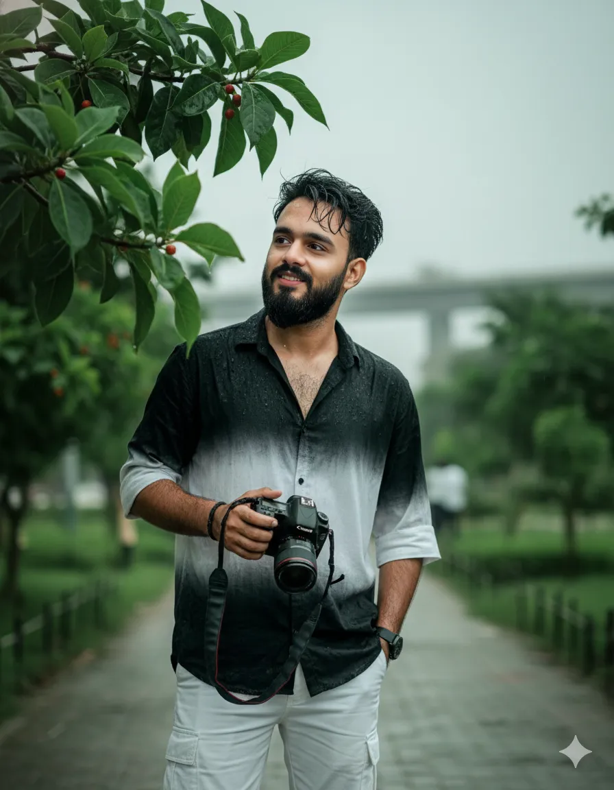 Creat a Bk hyper-realistic dark green portrait cinematic image with dramatic smile actions (uploaded photo 100% Face match) of A stylish handsome young man (refrence image given) with a slightly dark messy hairstyle and wearing a lose black & white gradient half lineing shirt and white cargo pant. He hold a Canon camera, He is looking thoughtfully off-canmera, captured in a candid, high-key cinematic outdoor portrait The composition is Framed by a branch of vivid.