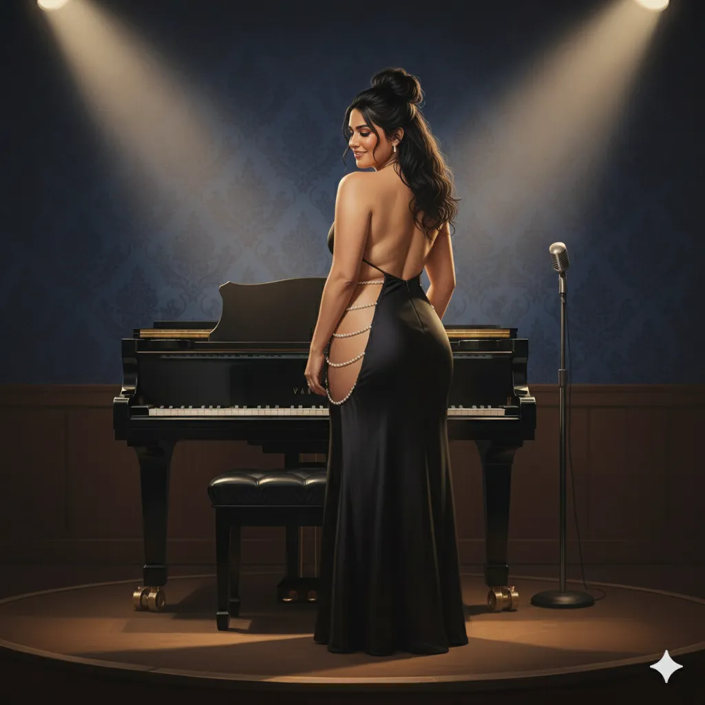 A jazz singer, back to the camera, smiling over her shoulder. Her black curly hair is in a high bun, wearing a black satin backless dress with circular side cutouts connected by thin pearl strands. Room has deep blue wallpaper, a glossy black stage piano in front. Light smoke effect. Mood: nightclub, jazz, sensual. Cinematic, dramatic lighting, 4K.