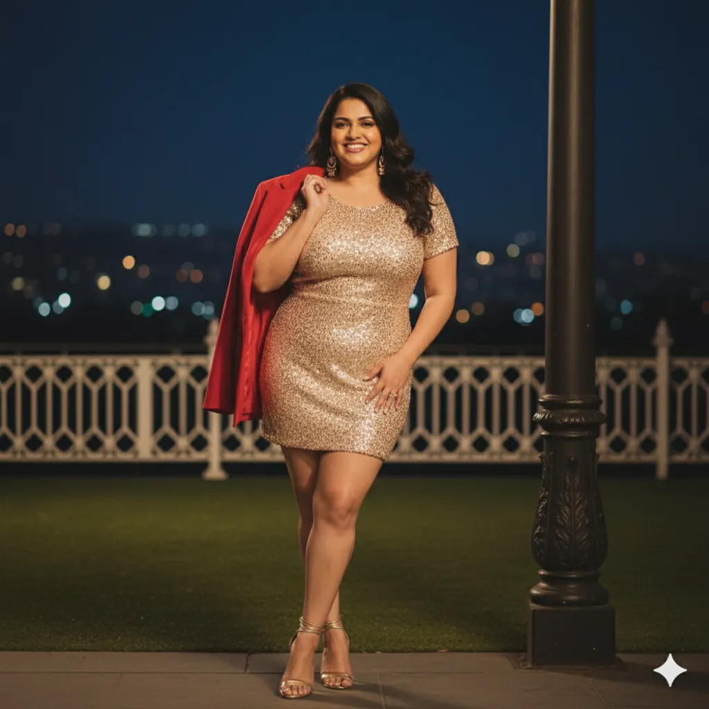 A confident, curvy Indian woman in her late 30s with long dark hair and a radiant smile stands elegantly at night on a dimly lit outdoor patio with manicured grass and a white decorative railing in the background. She wears a form-fitting, short-sleeved champagne-gold sequin mini dress that sparkles under soft ambient lighting, catching every glimmer. A bold red jacket is casually draped over one shoulder. She accessorizes with large dangling gold earrings, a delicate ring, and strappy gold high-heeled sandals with ankle ties. Her pose is relaxed yet glamorous—one hand lightly touching the jacket, the other resting on her hip—leaning slightly against a dark pillar. The background shows a blurred hillside dotted with faint city lights under a deep blue night sky. Warm, cinematic lighting with subtle bokeh highlights the luxurious, festive mood. Photorealistic, high-resolution portrait, 85mm lens, f/1.8, shallow depth of field, golden hour night vibe, fashion editorial style.