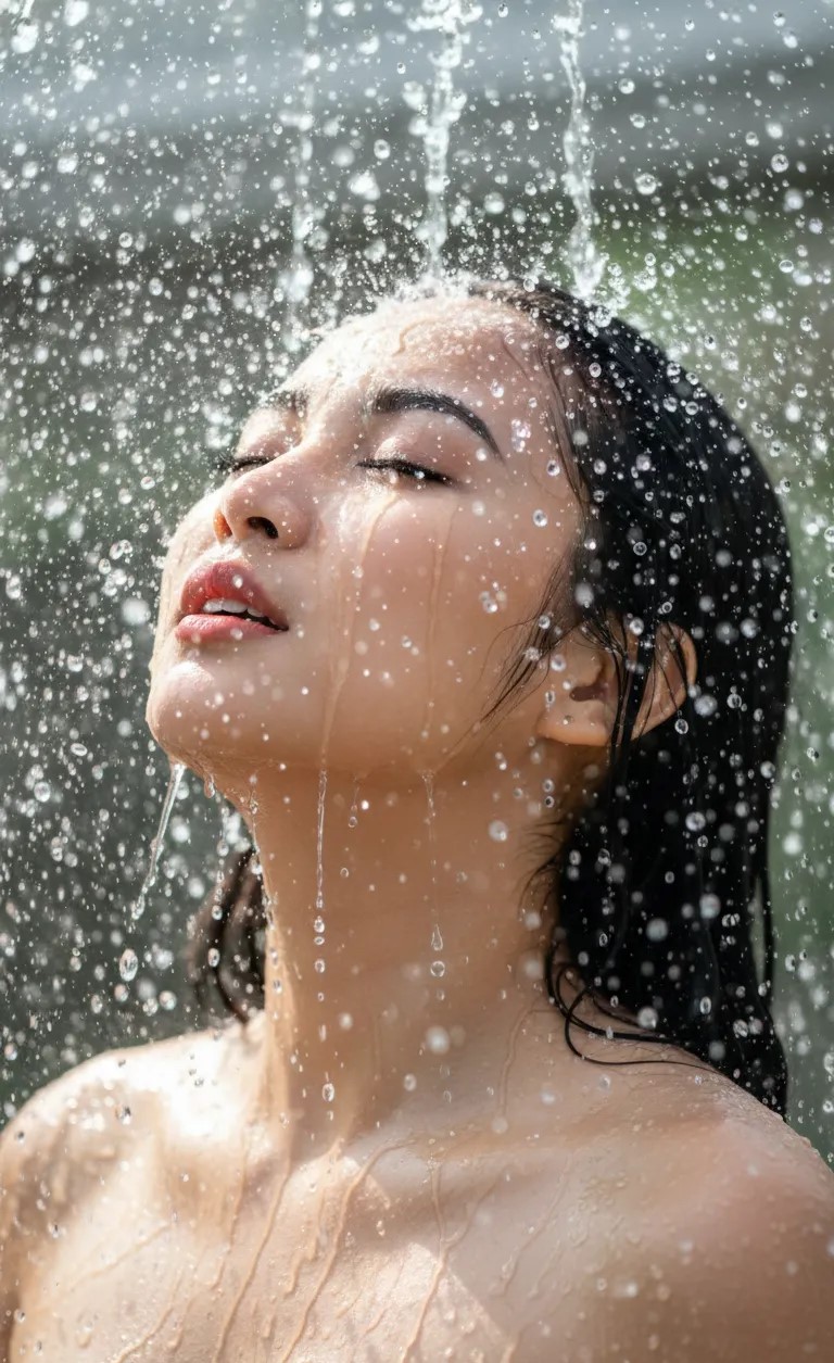 A sensual close-up portrait of a young woman with the same facial features as the uploaded reference, head tilted back, eyes closed in ecstatic pleasure, mouth slightly parted. Massive, sparkling clear water dramatically splashing and showering over her wet dark hair and face. Photorealistic professional photography, not a painting or digital art. Extreme cinematic backlighting, sun reflecting dazzling bokeh off every water droplet. High contrast, wet bangs clinging to her forehead, detailed natural skin texture, bare shoulders visible. Shot on a professional DSLR, frozen action, ultra-detailed, 8k, hyperrealistic, cinematic volumetric lighting, masterpiece.