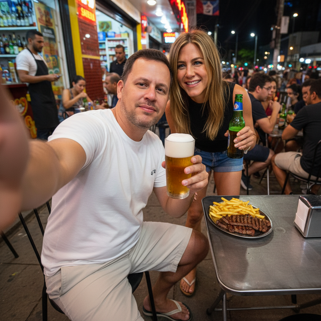Ultra-realistic first-person selfie, captured in a 9:16 vertical format, taken with a modern cell phone. The arm is extended forward, holding the phone, and the camera is tilted slightly downward, capturing a spontaneous and fun moment. The image must be in 4K quality, with impeccable photorealism, resembling an authentic photo taken on the spot. The man in the image (the selfie taker) must preserve 100% of his real physical and facial features, with a face identical to the original photo, natural expression, and true skin tone, without any modifications. He has a lean physique (5'9" tall and 165 lbs). His expression is relaxed, with a slight smile of satisfaction, holding a glass of cold beer with foam and visible condensation. He is wearing casual, lightweight clothing for the warm evening: a white cotton t-shirt, shorts, and flip-flops. In the background, on the right, sits Jennifer Aniston, smiling and charismatic, with a friendly expression. She's wearing a fitted black tank top, highlighting her figure, denim shorts, and flip-flops. She's holding a cold bottle of beer. She's leaning slightly to appear in the selfie, looking at the camera with a "cheers" or thumbs-up gesture. Scene: A lively street bar on the sidewalk of Belo Horizonte (Station Square) at night. The table is simple, metal or plastic, with a shallow plate with a side of fries and roast picanha on it. The lighting comes from the warm, neon lights of nearby bars, reflecting off the surfaces and creating a vibrant and welcoming atmosphere. In the background, people are chatting, waitresses passing by, and the typical big-city atmosphere. The artificial lighting creates soft reflections and shadows, highlighting the faces and details of the clothes and drinks. The image conveys joy, friendship, and authenticity, with vibrant nighttime colors, realistic skin and clothing textures, and a soft depth of field, giving it the appearance of a real selfie.