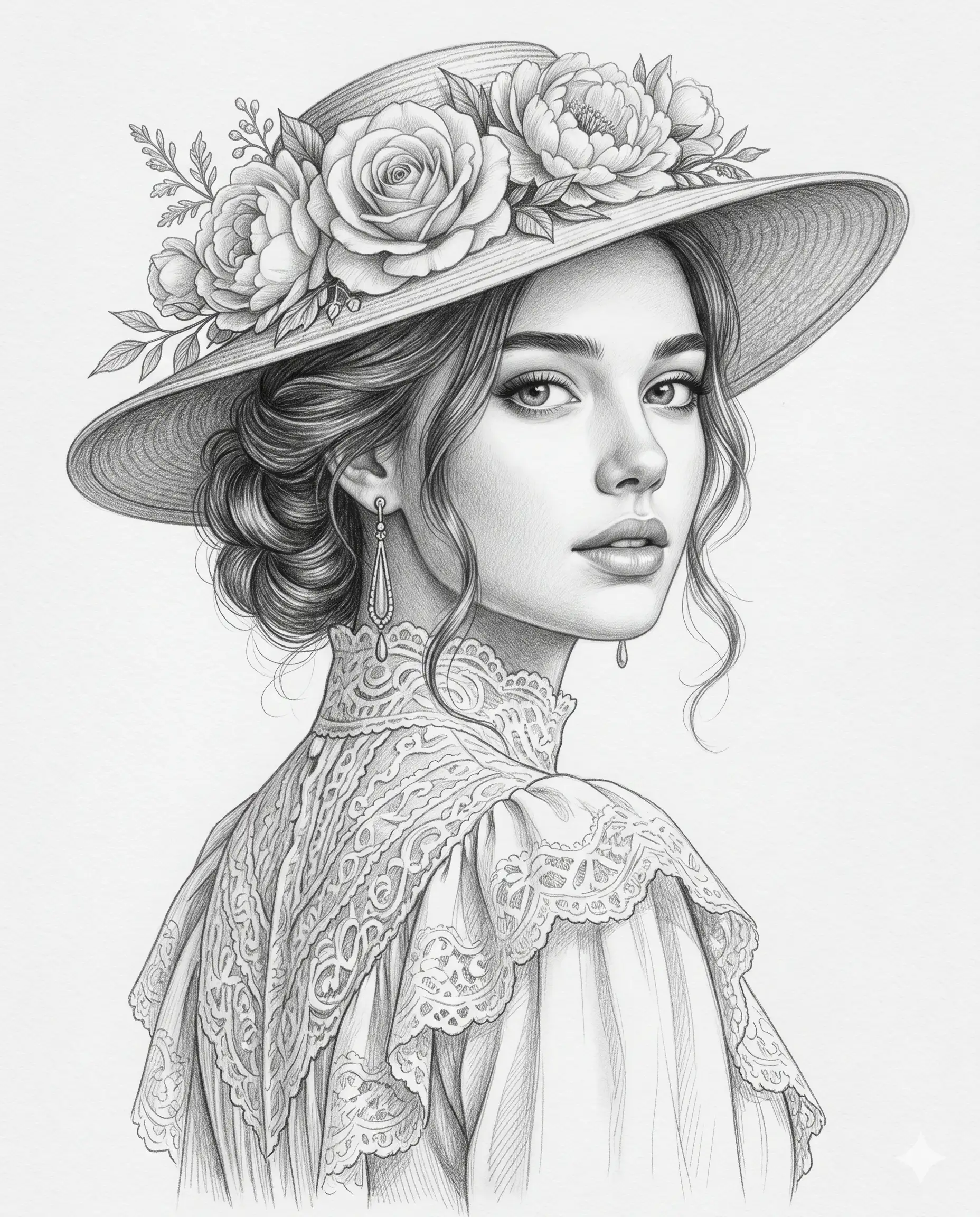 Create an ultra-detailed, soft graphite pencil portrait in a refined, classical illustration style, as if drawn by a master traditional artist on high-quality textured paper. The artwork must feel entirely hand-crafted — no digital or AI artifacts. Subject: A graceful woman in a vintage Victorian-inspired aesthetic. Delicate facial features, smooth skin tones, soft natural expression, slightly parted lips, and calm, elegant eyes looking back over her shoulder. Pose (LOCK): Upper-body portrait (chest-up). Body turned away from the viewer (~30–40°), with the back partially visible. Head turned back over the shoulder toward the viewer. Maintain natural neck curve and shoulder depth — no flat pose. Styling & Details: Wearing an ornate wide-brim hat decorated with large soft flowers and subtle foliage. Hair styled in a loose, elegant low bun with soft curled strands framing the face. Long delicate drop earrings with fine detailing. Outfit features a high-neck vintage blouse with intricate lace patterns, ruffles, and soft fabric folds. Every fabric texture must be highly detailed yet soft. Art Style (VERY IMPORTANT): – Hyper-detailed graphite pencil shading – Extremely soft gradients and smooth tonal transitions – Fine linework with subtle pressure variation – No harsh outlines, no cartoon feel – Realistic skin shading using layered strokes – Visible but refined pencil texture (paper grain slightly noticeable) – Depth created through light and shadow, not contrast exaggeration Lighting: Soft diffused studio lighting from front-left, creating gentle highlights on face and smooth shadow transitions. No harsh shadows. Background: Clean, minimal, light gray paper background with subtle texture. No distractions. Quality: Extremely high detail, 8K-level precision. Every strand of hair, fabric fold, and ornament must feel carefully hand-drawn. 4:5 aspect ratio. Negative Prompt: No digital painting look, no AI artifacts, no over-sharpening, no plastic skin, no exaggerated contrast, no modern styling, no color — strictly monochrome graphite.