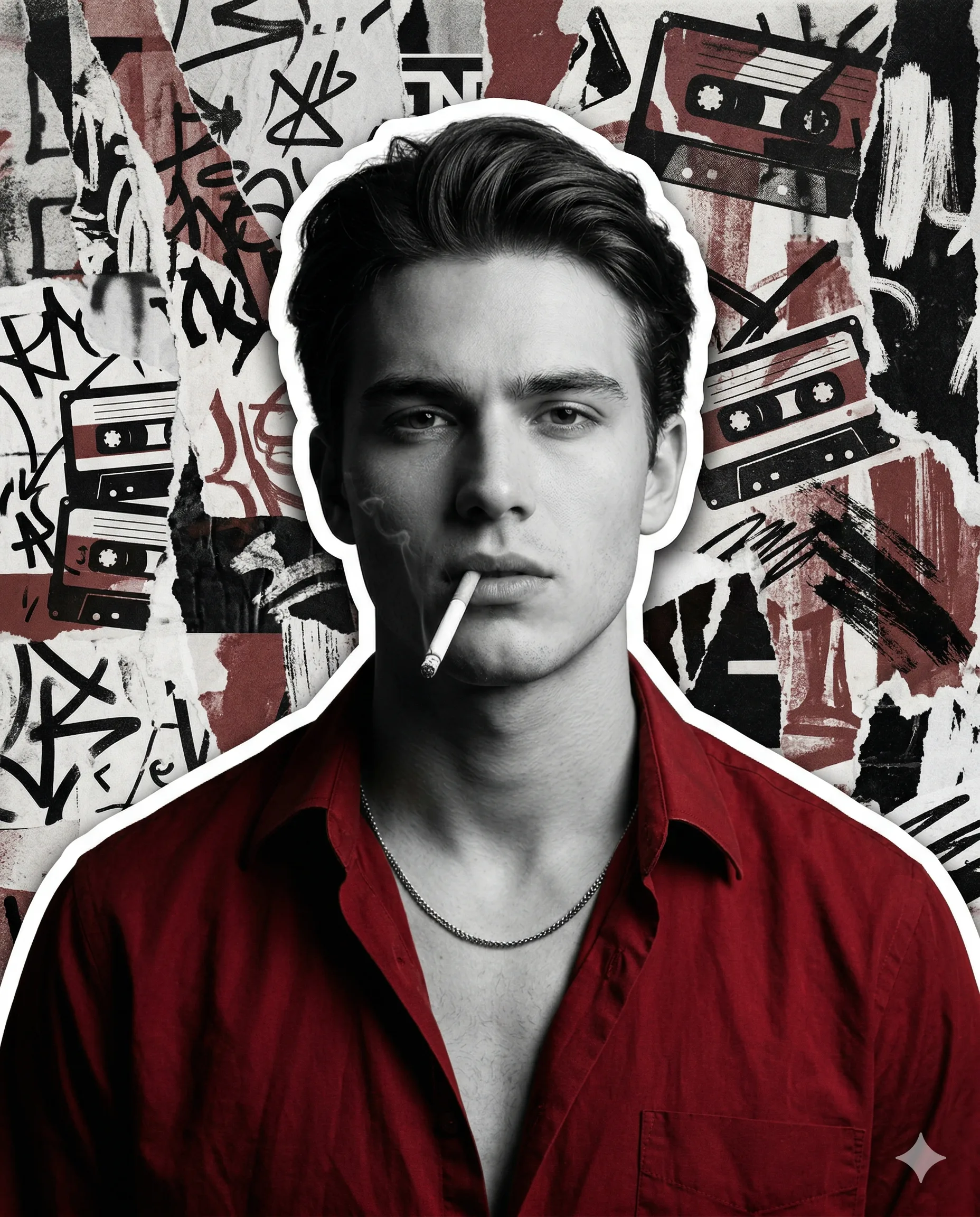 Create a bold, high-contrast editorial portrait with a graphic collage aesthetic. The subject is centered in the frame in a medium close-up composition (mid-chest to head), facing directly toward the camera with a cool, attitude expression. The posture is straight and still, creating a strong, confident presence. The subject wears a slightly open red shirt with visible fabric folds and a subtle metallic chain around the neck. A cigarette is held naturally between the lips, with a faint trail of smoke rising softly, adding a raw, cinematic mood. The portrait is treated in selective color style: the face and skin tones appear in black and white, while the shirt remains a deep, saturated red, creating strong visual contrast and focus. The subject is cut out with a clean white outline/sticker-style border, separating them clearly from the background. Background is a layered urban collage made of torn paper textures, graffiti scribbles, abstract symbols, cassette tape illustrations, and rough brush marks. The color palette consists of black, white, and muted red tones, arranged in a chaotic but balanced composition. No readable text—only expressive visual elements. Lighting follows a Rembrandt-style setup: a single directional light from the upper side creates soft highlights on one side of the face and a subtle shadow falloff on the other, forming depth while keeping facial features well-defined. The lighting should feel controlled, studio-like but slightly gritty to match the urban theme. Maintain sharp facial details, natural skin texture, and realistic shadows. Avoid over-smoothing or artificial glow. Framing should be tight but well-balanced, with consistent spacing around the head and shoulders so the subject does not feel cropped or stretched. --ar 4:5