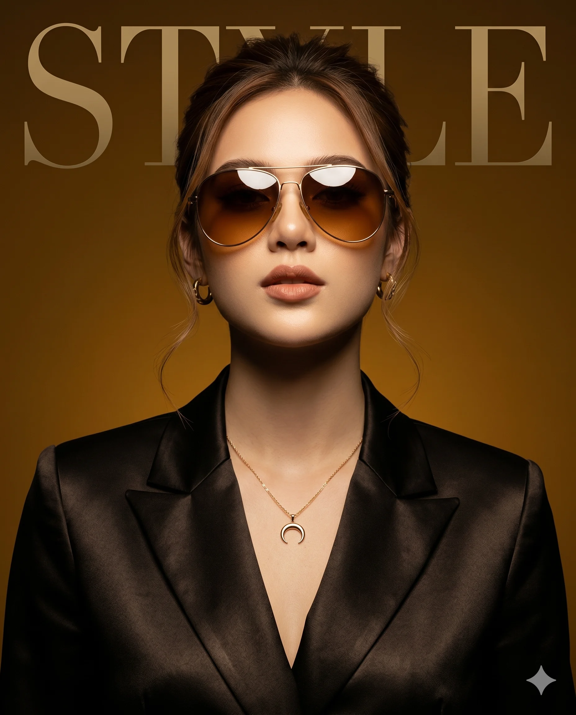 Create a high-fashion editorial magazine cover with a centered, symmetrical medium close-up (chest-up). The subject faces forward with a natural, relaxed posture, chin slightly lifted and gaze subtly directed downward through the lenses, creating a cool, confident, stylish editorial vibe without stiffness. Identity preservation: keep the same person’s facial structure, proportions, and unique features consistent with the input image. Maintain likeness naturally. Avoid altering face shape or key features. Do not over-modify or stylize the face. The subject wears oversized gold aviator sunglasses with deep amber-brown gradient lenses. Lenses include clean, high-contrast white studio reflections. Accessories are clearly visible: small gold hoop earrings and a delicate gold chain necklace with a centered crescent moon pendant resting naturally on the chest. The outfit is a perfectly tailored deep black satin blazer (true black). The fabric appears smooth, soft, and premium, with subtle light reflections and clean structure. No wrinkles, no stiffness, no faded tones. Makeup detail: lips feature a soft terracotta-nude semi-gloss lipstick, smooth and refined with gentle highlights, maintaining a natural editorial finish. Hairstyle is a clean tied-back updo, neatly pulled away from the face with slight crown volume. A few soft loose strands near the ears add natural elegance. Background is a rich deep ochre-gold with warm brown undertones, with a subtle radial gradient slightly brighter behind the head. Large serif text “STYLE” appears behind the subject in a muted metallic gold tone, softly integrated into the background. The subject slightly overlaps the text for natural depth. Lighting is soft yet directional and premium: a gentle key light from front-right creating warm highlights, soft shadows under the jawline and blazer, a subtle rim light for separation. The overall image should feel rich, deep, and editorial, with balanced contrast and no flat lighting. 4K, Ultra-realistic, sharp details, luxury fashion magazine aesthetic. --ar 4:5