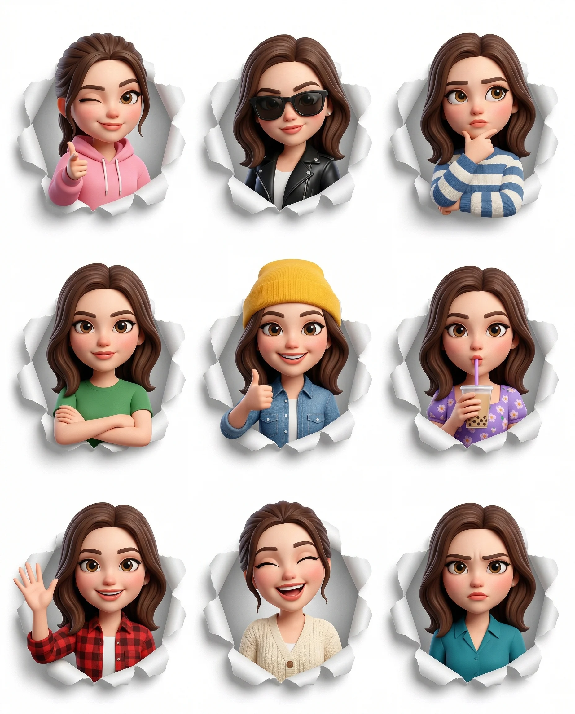 Create a set of 9 expressive 3D cartoon-style avatar stickers of the same person, arranged in a clean 3×3 grid layout. The character must maintain consistent facial structure, proportions, skin tone, and identity across all frames. STYLE (CRITICAL): Highly stylized Pixar / emoji-style 3D character, with slightly oversized head and smaller compact body (chibi-like proportions). Eyes must be slightly larger, round, and highly expressive. Facial expressions should feel cute, playful, and exaggerated, not realistic. Soft, smooth, rounded features with a friendly, Pixar-style premium finish. EXPRESSIONS & VARIATION: Each frame must have different expression, different body language, and different outfit with different colors, including: winking and pointing, cool & stylish, thinking with hand on chin, arms crossed calm pose, thumbs-up, drinking, waving, joyful laughing, and confused/serious look. COMPOSITION (STRICT): Each avatar appears to emerge through a torn paper hole, with realistic, ripped edges wrapping naturally around the half-body. Use the light grey gradient colour inside the paper hole. Character should feel slightly popping out (3D depth), not flat. Only half body (chest-up). Perfect grid alignment, equal spacing, no distortion. LIGHTING: Soft studio lighting, even and clean. No harsh shadows. Smooth highlights. BACKGROUND (LOCKED): Single cool, crisp pure white background across entire grid. No gradient, no variation, no color shift between tiles. CONSISTENCY RULE: All 9 avatars must clearly look like the same person with identical identity. RENDER QUALITY: Ultra-clean, high-resolution, sharp, polished 3D render. No artifacts, no deformation, no realism bias, no plastic look. Aspect Ratio: 4:5 vertical (full grid fits perfectly)