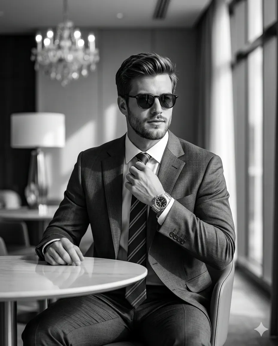 Ultra realistic black and white portrait of a confident stylish man sitting at a modern round table in a luxurious indoor setting, wearing a well tailored grey suit, white dress shirt and striped tie, adjusting his tie with one hand, wearing dark sunglasses and a luxury wristwatch, looking slightly to the side with a calm confident expression. Elegant modern interior background with soft blur, chandelier hanging from the ceiling and a stylish lamp in the background, shallow depth of field, cinematic lighting, soft window light from the side creating dramatic shadows. Professional fashion magazine photoshoot style, sharp focus on face and suit texture, high detail, luxury lifestyle vibe, monochrome photography, 85mm lens, f/1.8, 4:5 aspect ratio, ultra HD, photorealistic, editorial photography, high contrast lighting.