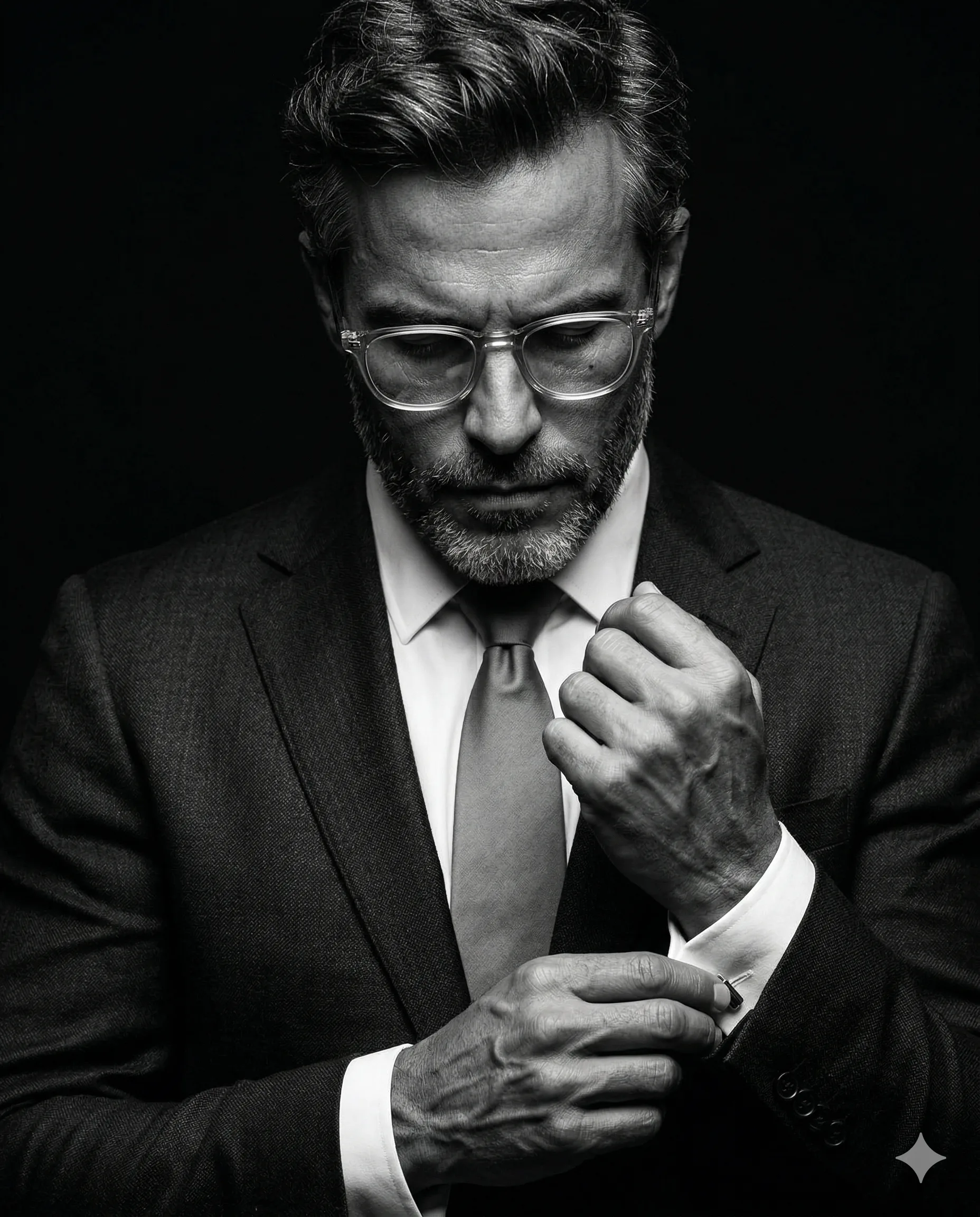 Use the uploaded image as the ONLY facial and identity reference. Preserve 100% exact facial structure, proportions, skin tone, hairstyle, grooming details, and overall likeness. Do not beautify, stylize, or alter identity. Maintain natural skin texture, pores, fine lines, and imperfections for true realism. Create a high-contrast, cinematic black-and-white portrait in a low-key studio lighting style (film noir / luxury editorial). Composition & Framing 4:5 vertical aspect ratio Medium close-up (chest to head, shoulders clearly visible) Subject centered Head perfectly tilted downward Gaze focused on hands while adjusting cufflink Hands prominently visible in frame (important detail element) Slight top hair crop allowed for tight framing realism Pose (LOCKED) One hand adjusting the cufflink of the opposite wrist Fingers naturally tense, showing subtle veins and anatomical detail Body still, composed, controlled Lighting (CRITICAL) Single overhead directional key light (spot / gridded look) Strong downward light creating shadows in eye sockets Face partially shadowed → eyes not fully visible Bright highlights on shirt collar, knuckles, and glasses Subtle rim light on hair/shoulder for separation from black background Deep blacks with smooth tonal falloff (no crushed details) Styling Dark tailored suit (sharp, structured, visible fabric texture) Crisp white dress shirt Dark matte tie Minimal cufflink detail Transparent or subtle eyeglasses catching light reflections Technical Look Shot on 85mm portrait lens Aperture ~ f/2.8 – f/5.6 (sharp face, slight falloff on hands/suit) Ultra crisp, micro-detailed textures (skin, beard, fabric, veins) No AI softness, no plastic skin, no over-smoothing Background Pure black or near-black seamless backdrop No distractions, no gradients Mood & Tone Serious, introspective, powerful Quiet intensity, “preparation before action” energy Cinematic, luxury editorial feel Output Quality Ultra-realistic High dynamic range monochrome Sharp, detailed, professional studio finish