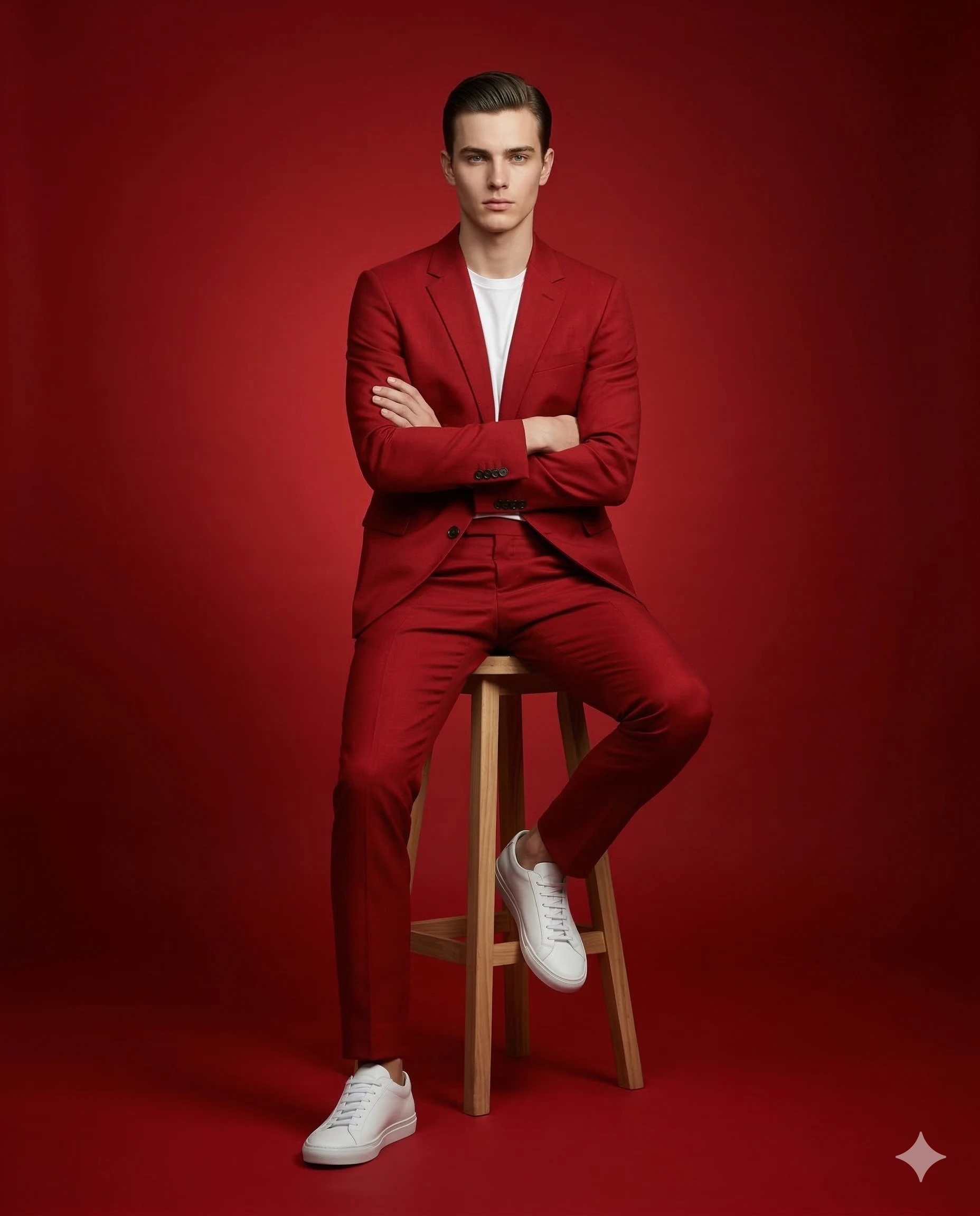 Create a full-body ultra-realistic luxury fashion editorial portrait of a confident man seated on a tall minimalist natural wooden stool, based on the provided reference image of the subject. Composition & Framing Vertical 4:5 portrait composition designed for a high-end magazine cover aesthetic. The subject occupies approximately 65–70% of the frame height, perfectly centered with intentional negative space to create a refined, premium editorial balance. Full seated posture visible from head to shoes with clean framing and no cropping. Camera & Lens Shot at eye level using an 85mm lens look, creating natural compression and a premium portrait feel. Ultra-sharp subject focus with a subtle depth falloff toward the background for cinematic separation. Environment & Background Seamless studio environment with a deep, rich monochromatic red palette. The background features a luxury-grade tonal gradient: slightly brighter, refined red near the subject smoothly transitioning into deeper, saturated red toward edges No black clipping — only controlled tonal richness within red spectrum. Floor blends perfectly with the backdrop, creating an infinite studio void. Lighting (Luxury Editorial Setup) High-end studio lighting setup with soft key + controlled fill + subtle rim separation. Key light: soft, frontal-above for clean facial sculpting Fill light: balanced to eliminate harsh shadows while maintaining depth Rim light (very subtle): adds edge separation from background Lighting creates: gentle specular highlights on suit fabric realistic skin rendering with depth premium commercial polish (not flat, not dramatic) Pose Relaxed yet dominant seated posture. Torso upright with a natural slight angle (editorial asymmetry) Arms folded confidently across the chest One leg grounded firmly on the floor Other leg resting on the stool crossbar Body language conveys controlled confidence, not stiffness. Expression Calm, self-assured, composed expression. Direct eye contact with a subtle assertive intensity. No exaggerated emotion — quiet luxury attitude. Wardrobe & Styling Tailored monochromatic red luxury suit with precise fit and clean structure. Premium fabric with subtle texture visibility under lighting. Minimal white crew-neck t-shirt for contrast. Slim-fit trousers with clean break. White low-top minimalist sneakers — crisp and modern. Material & Detail Rendering Highly detailed rendering of: fabric texture (fine weave, natural folds) realistic skin pores and micro-texture subtle reflections on shoes clean edges and stitching details No artificial smoothing or CGI plastic effect. Color Science & Finish Strict monochrome red dominance with controlled tonal variation. No color contamination (no green/blue shifts). Professional color grading: rich reds balanced highlights soft contrast curve Aesthetic Direction Luxury fashion campaign GQ / Vogue editorial quality Minimalist, bold, commanding “Quiet power” visual narrative Style Keywords ultra-realistic, luxury editorial, high-fashion portrait, cinematic lighting, premium studio, monochrome red, sharp focus, commercial photography, modern luxury Face & Identity (Critical) Maintain 100% facial identity accuracy from the reference image. Preserve: bone structure skin texture facial hair (if present) proportions and expression No beautification, no stylization drift.