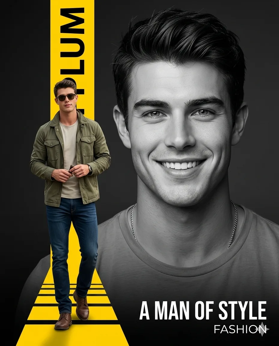 Create a 4:5 aspect ratio, hyper-realistic 8k composite image, designed as a professional graphic poster, featuring a dynamic dual-portrait composition against a smooth, dark gray to black gradient background. On the right, a large, grayscale, medium close-up studio portrait of a smiling person, uploaded face as reference, looking directly at the viewer with a broad smile. The subject has well-groomed hair and a short beard, wearing a simple t-shirt and a visible chain, illuminated by soft, cinematic front-right lighting creating subtle highlights and shadows. On the left, a smaller, full-body, full-color figure, uploaded face as reference, stands on a prominent, thick, vertical yellow graphic bar that extends from the top to the bottom of the frame and recedes into the background with black horizontal lines suggesting a path. This figure is seen in a slightly turned pose, wearing sunglasses, an open olive-green jacket over a light t-shirt, dark blue jeans, and brown shoes, holding an object in clasped hands. Vertical black text, 'PROMPT PLUM', is prominently displayed on the yellow bar, oriented bottom-to-top, partially obscured by the standing figure. At the bottom right, white text reads 'A MAN OF STYLE' with 'FASHION' below it. The overall image features highly detailed textures and a clean, sharp aesthetic, combining studio photography with graphic design elements.