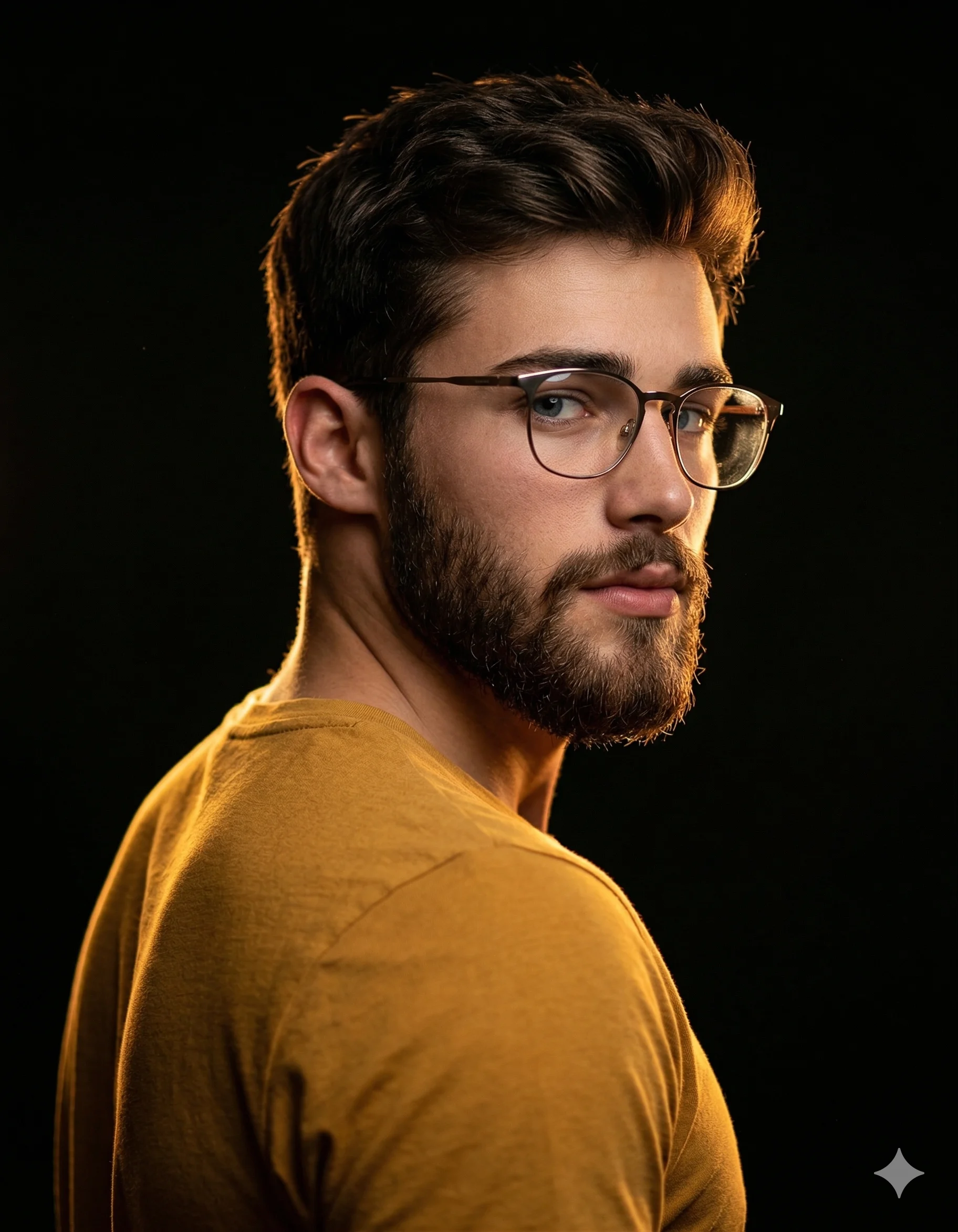 [Exact Facial Identity from Reference]. Male with dark, textured, naturally styled hair. Wearing modern, thin-framed eyeglasses (brownish-metal tone) with specular highlights and controlled lens reflections. Attire: Fitted mustard-yellow cotton t-shirt, featuring high-frequency fabric texture details clearly defined by the lighting, with parts of the fabric transitioning into deep shadow. COMPOSITION Three-quarter back perspective, with the subject looking directly back over his shoulder towards the lens. This is a dramatic 'character reveal' pose with a powerful, direct gaze. Off-center vertical framing with significant negative space to enhance the cinematic editorial feel. Upright, confident posture with shoulders angled away. LIGHTING High-contrast Chiaroscuro arrangement. Primary high-intensity golden backlight/rim light positioned to create a sharp, glowing halo along the sagittal plane of the textured hair, ear, jawline, and beard contour, and also the back of the shoulder, defining the edge. Chromatic consistency between the warm mustard tones and the golden rim highlights. Subtle secondary soft-fill/bounce to articulate minimal facial geometry—specifically the nasal bridge, zygomatic bone, and eye area—without breaking the low-key, mysterious aesthetic. TECHNICAL SPECS Optics: 85mm f/1.8 prime lens; wide aperture for ultra-fine depth separation. Resolution: 64K DSLR-quality, ultra-hyperrealistic render. Sensor/Settings: Low ISO for noise-free, ink-black shadows; high dynamic range (HDR) to preserve edge-light detail and facial clarity. Rendering: Octane Render, Unreal Engine 5 style; sharp edge definition with soft falloff into a deep, matte-black background (0,0,0 luminosity). Texture: High-fidelity skin pores, individual beard and hair follicles, and microscopic lens dust for maximum photorealism. High-frequency fabric weave of the t-shirt is visible.