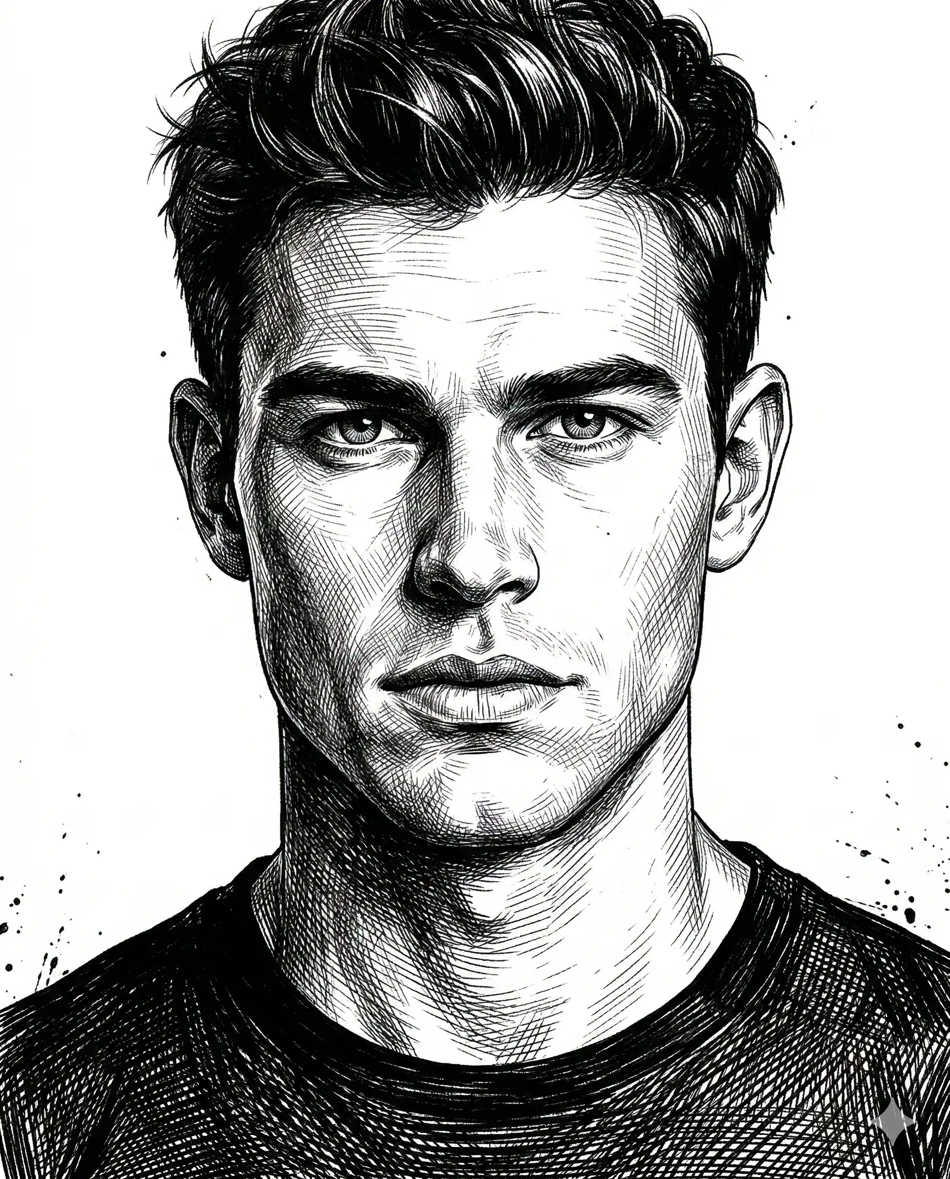 Use the uploaded image strictly ONLY for face and identity reference. Preserve exact facial structure, proportions, eye shape, nose structure, jawline sharpness, grooming, and natural asymmetry. Pose & Body Position: Subject is seated upright (not leaning), with a straight spine and stable posture. Neck is perfectly straight and aligned vertically with the spine — no tilt, no rotation, no forward/backward bend. Head remains level and centered, facing directly forward. Ultra-tight vertical portrait (4:5), crop from mid-neck to slightly above hair top, face centered, straight-on angle, head filling ~85–90% of frame, minimal upper shoulder visibility. Neutral intense expression, eyes directly at camera, no smile, lips closed, subtle tension in eyes and brow. Hair should be thick and natural with realistic flow, not overly stylized or inflated. Avoid perfect volume or “hero hair”. Maintain slight irregularity, weight, and believable strand direction using sharp ink strokes. Outfit: Black minimal fitted high-neck clothing, matte fabric, subtle folds near neck and shoulders, rendered using cross-hatching (not flat black fill). Style: ultra-detailed black-and-white ink engraving illustration. Heavy cross-hatching and line-based shading. Use varied stroke density and direction to define facial planes. Avoid uniform or repetitive patterns. Include scratch lines, etched strokes, and raw ink texture for a hand-drawn feel. Lighting: strong chiaroscuro using line density (no gradients). One side of face slightly darker. Deep shadows under cheekbones, jawline, eye sockets, and neck. No soft lighting. Details: subtle facial scars and scratch marks. If a beard is present in the reference image, it is rendered with fine directional strokes, and skin texture is defined through linework (not smooth shading). Background: clean white with minimal ink splatter around edges only. No environment. Avoid generic face generation. Preserve raw individuality from reference. Negative prompt: anime, cartoon, soft shading, gradients, 3D, CGI, photorealism, color, glow, blur, smooth skin, beautified face, generic face, over-stylized hair, perfect symmetry, detailed background, logos, text, accessories, vector art