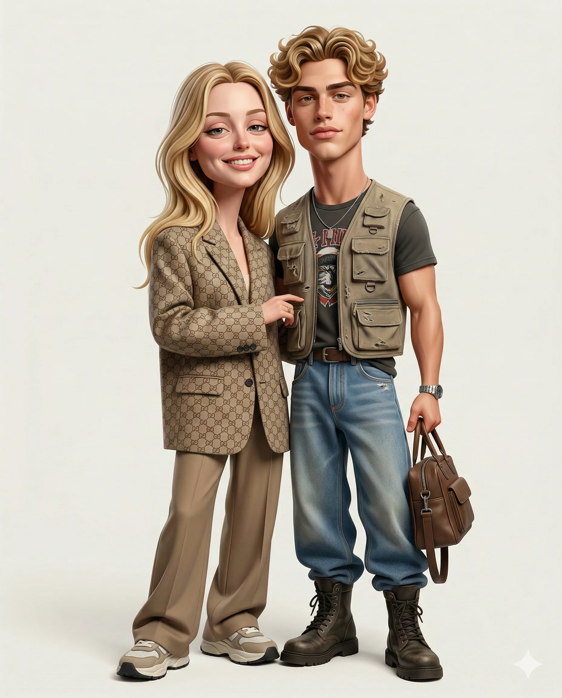 Create an exaggerated, stylized 3D caricature portrait of the two people in the attached reference photo, Full-body (head-to-toe) shot. Preserve both subjects' identities, facial likenesses, skin tones, and defining features, but reinterpret them into bold, caricatured 3D forms with full-body proportions. Apply strong, intentional deformation to each character, including elongated necks, oversized head-to-neck ratios, droopy eyelids, heavy lips, and subtle facial asymmetry. Extend the exaggeration into their full-body proportions so the stylization feels cohesive from head to toe. Slight proportional variations between the two characters should enhance individuality and personality contrast while keeping them visually harmonious. They must remain human-like but clearly stylized, expressive, and artistically exaggerated. Position them in a dynamic, character-driven full-body composition that reflects chemistry and connection — standing close, subtly interacting, or posed in a high-fashion editorial stance. Their body language should feel intentional and cohesive rather than romanticized or cute. The camera angle must be eye-level, aligned naturally with the characters’ faces to maintain presence and balance. Use a straight-on perspective with no dramatic tilt, distortion, or extreme wide-angle effects. The framing should capture both characters fully from head to toe while maintaining proportional clarity and compositional symmetry. Dress both characters in coordinated luxury fashion with bold, high-end accessories. Their styling should complement each other while maintaining individuality, creating a weird, fashion-forward, collectible aesthetic that feels elevated and character-driven rather than realistic or cartoonish. Use a clean, controlled surface finish with smooth, studio-quality skin for both subjects. Avoid random textures, blemishes, freckles, dirt, grain, speckling, or noise. Materials should appear polished, premium, and carefully designed, with subtle subsurface scattering and realistic skin shading. Illuminate the scene with neutral studio lighting, soft diffused shadows, and even illumination with no harsh contrast. Use a plain neutral gray or off-white background. Render in ultra-high definition 4K quality with extreme detail, sharp focus, and cinematic clarity. Include micro-surface detail, high-resolution textures, physically based rendering (PBR), global illumination, soft reflections, and refined material definition. The image should appear crisp, clean, noise-free, and professionally studio-rendered. No text, logos, or watermarks. Aspect ratio: 4:5. Negative prompt: Cropped frame, low quality, head crop, toe crop