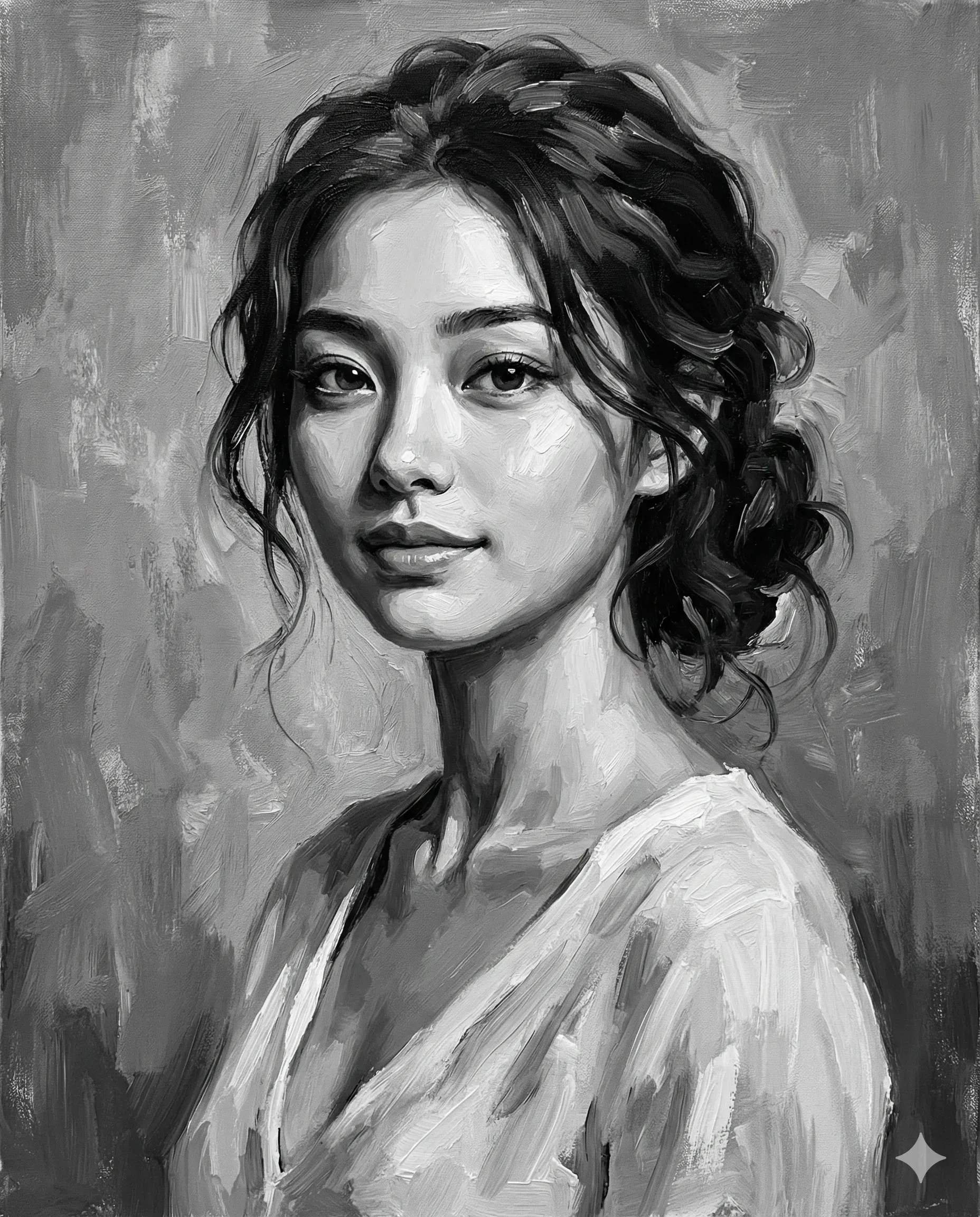 Create a highly detailed monochromatic portrait rendered in a classical oil painting style, painted in black-and-white grayscale with rich impasto brush texture and visible painterly strokes. The artwork should resemble a traditional museum-quality oil painting on canvas. 8K ultra-high resolution, vertical 4:5 aspect ratio. Face Matching & Identity Accuracy Use the attached reference image for exact facial structure and likeness accuracy. Preserve the same facial proportions, jawline structure, cheekbone shape, eye shape, nose proportions, lip structure, and overall facial symmetry. Maintain strong identity fidelity while translating skin details into painterly brush strokes. Pose & Body Angle The portrait uses a classic bust composition, framed from the upper chest to the top of the head. The subject’s torso is turned slightly away from the camera (around 20–30°) while the head turns back toward the viewer, creating a natural three-quarter portrait angle. The shoulders remain relaxed and natural, with the neck upright and balanced. The subject maintains direct eye contact with a calm, gentle expression and a subtle closed-mouth smile. Eyes Natural eyes with subtle shadows beneath the lower eyelids and softly arched eyebrows painted with expressive brush strokes. Each eye contains a small bright catchlight in the upper-left iris, suggesting a directional light source. Hair Thick dark wavy hair arranged in a loose updo, with soft strands framing the face. Hair volume is created using broad painterly strokes rather than individual strands. Lighting (Chiaroscuro) Classic chiaroscuro lighting with a strong light source from the upper-left side of the frame. The left side of the face is illuminated while the right side falls into soft shadow, sculpting the facial structure and creating strong depth. Texture & Brushwork Visible impasto oil paint texture across the entire composition. Facial strokes follow the natural contours of the face while hair and clothing use broader expressive strokes. Clothing A simple white V-neck garment painted with loose white-gray brush strokes, keeping the viewer’s attention on the face. Background An abstract textured gray oil-paint background with soft tonal variations and painterly strokes that separate the subject from the background. Style Ultra-detailed 8K classical oil painting, realistic brushwork, dramatic tonal contrast, visible canvas texture.