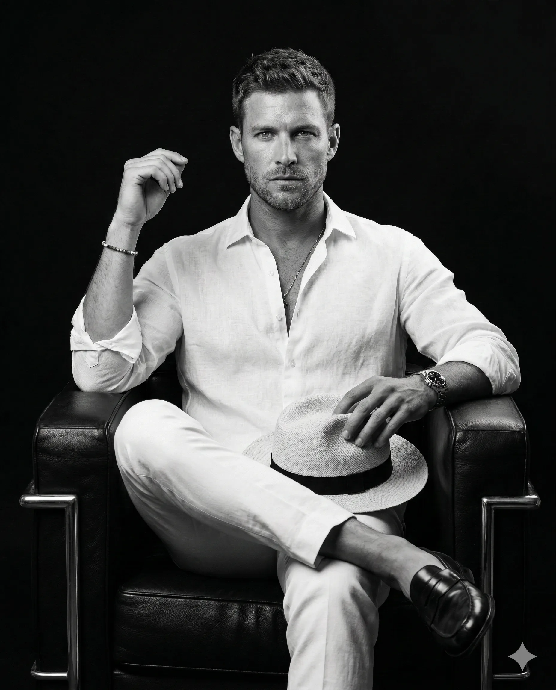 Create a high-contrast black and white studio portrait of a ruggedly handsome man sitting confidently in a dark leather club chair. Use the attached reference image for exact facial structure and likeness accuracy. He has an intense, direct gaze into the camera. His expression is serious, composed, and quietly commanding. Face Matching & Identity Accuracy: Match the exact facial structure from the reference image — same jawline definition, beard density and shape(if present in the reference image), haircut length, skin tone, eye shape, nose proportions, and calm neutral expression. Maintain natural skin texture with realistic pores (no over-smoothing) He wears a crisp white linen or fine cotton long-sleeve shirt, unbuttoned halfway down the chest, slightly open to reveal a thin chain necklace with a small pendant. Sleeves are subtly pushed back. He pairs it with tailored white trousers. He sits in a relaxed yet powerful “figure-four” leg cross position — right ankle resting horizontally over left knee. On his feet are dark, polished leather penny loafers worn without socks. In his left hand, resting across his lap, he gently grips the brim of a light-colored Panama or fedora hat with a dark contrasting ribbon band and centre dent crown. His right arm rests on the chair armrest, elbow bent, hand raised near shoulder height with relaxed fingers. Accessories include: Thin pendant necklace Minimalist beaded bracelet on right wrist Classic metallic wristwatch with a dark dial on the left wrist The chair is a heavy, square-framed, dark leather club. 💡 Lighting & Cinematic Style Dramatic chiaroscuro studio lighting using a Rembrandt-style setup. A large softbox positioned camera-right and slightly above the subject creates strong directional lighting. The right side of the face and body is illuminated brightly Left side falls into deep, sculptural shadows Subtle Rembrandt triangle of light visible on the shadowed cheek High contrast but controlled highlights White clothing retains fabric texture without clipping Shadows fade smoothly into rich black 🎞 Composition & Technical Detail Full body visible from head to foot Perfectly centred composition Generous headroom Even side negative space Seamless pure black background (no light spill) Studio environment Extremely sharp focal plane Hyper-detailed textures: leather grain, linen weave, skin pores, stubble clarity Wide dynamic range Cinematic tonal balance Fine art editorial photography Eye-level shot 85mm lens equivalent f/5.6 aperture ISO 100 8k Ultra high resolution Aspect ratio 4:5 Photorealistic 🎨 Style Keywords Fine art portrait, luxury editorial, masculine elegance, timeless style, dramatic lighting, cinematic monochrome, fashion magazine shoot, sophisticated minimalism, modern gentleman aesthetic.