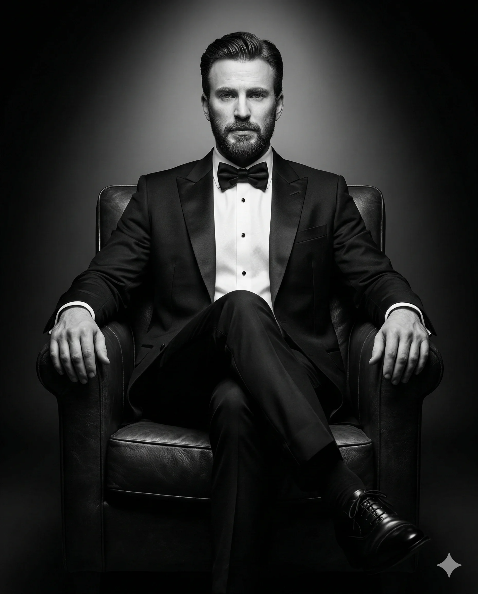 Create an ultra-realistic black-and-white cinematic studio portrait in 8K resolution, vertical 4:5 aspect ratio. Reference & Identity (High Priority) Use the uploaded reference image as the primary source of identity. Preserve the subject’s exact facial structure and likeness, including jawline shape, beard density (if present), hairstyle, skin tone interpretation in monochrome, eye shape, nose proportions, and natural skin texture. Do not alter or beautify facial proportions. The final portrait must clearly resemble the same person. Composition & Framing Full-length seated portrait, centred in the frame. Framing cuts slightly above the ankle rather than showing the complete figure. The subject sits in a dark leather armchair, facing the camera directly, creating a strong, symmetrical composition. Right leg crossed over the left knee, arms resting naturally on the chair’s armrests, shoulders upright and composed. Maintain generous dark negative space around the subject. Expression & Presence Calm, serious, stoic expression with slightly narrowed eyes. Direct eye contact with the camera, conveying authority, control, and quiet confidence. Wardrobe Classic formal evening attire: tailored black tuxedo with satin peak lapels crisp white dress shirt with black studs black bow tie tuxedo trousers polished black Oxford shoes Lighting Dramatic cinematic top-down spotlight with strong directional light. Low-key lighting with deep shadows, high contrast, and film-noir chiaroscuro. Minimal or no fill light so the subject appears illuminated within a pool of light, fading into a charcoal-to-black vignette. Style & Quality Professional studio photography style with sharp detail, rich tonal contrast, and visible texture in leather, fabric, and facial hair. Luxury film-noir editorial portrait aesthetic. Negative Prompt low quality, blur, soft focus, distorted face, altered facial structure, extra limbs, cropped head, cropped body, overexposed face, underexposed face, washed lighting, flat lighting.