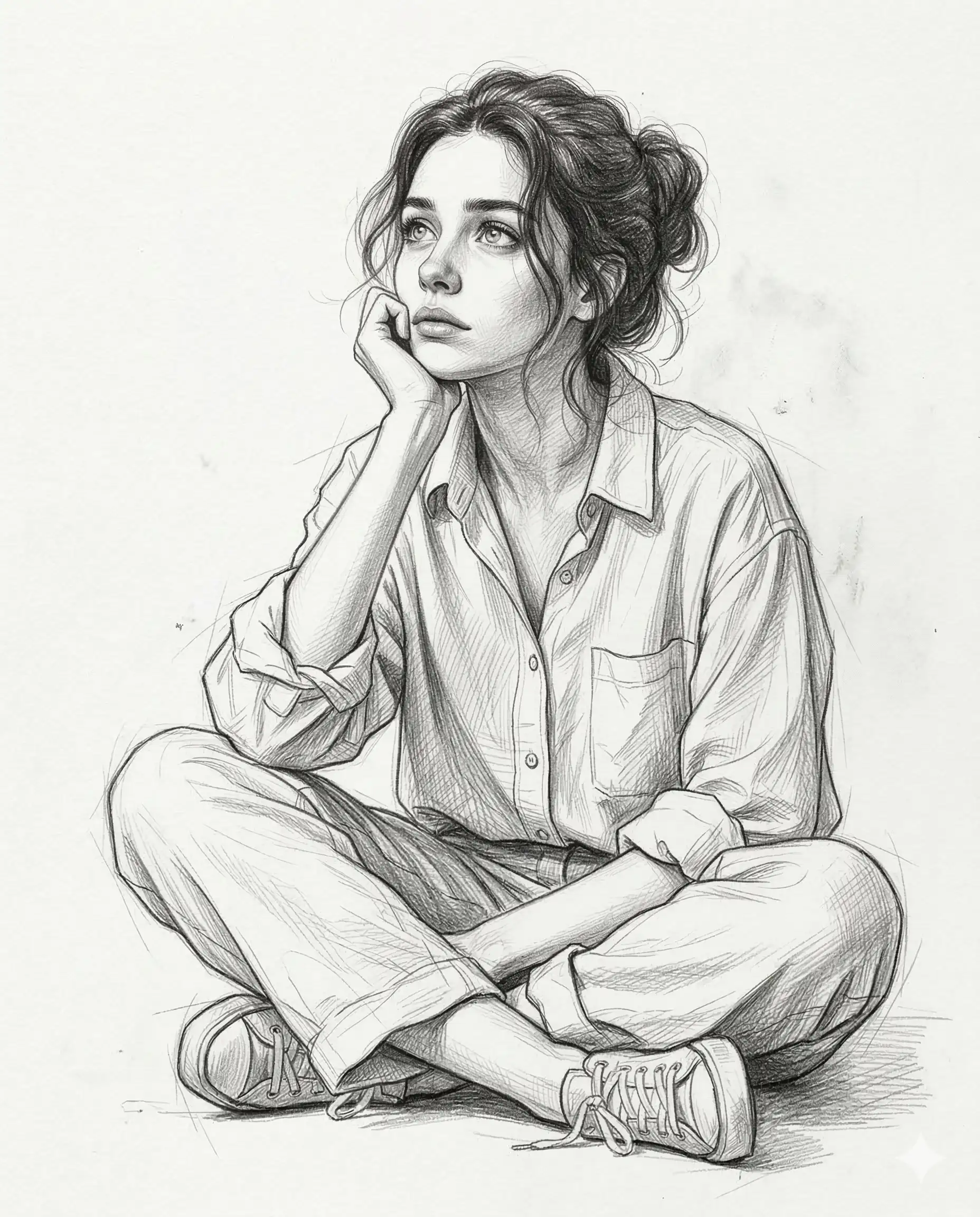 Create an 4k ultra-detailed classical graphite pencil drawing of a contemplative woman sitting on the ground. The artwork is executed in a traditional academic sketch style, combining precise contour lines, delicate cross-hatching, and subtle graphite shading. The drawing shows visible pencil strokes, layered shading, and natural sketch marks, preserving the authentic feeling of a hand-drawn illustration on textured paper. Identity & Face Matching (Strict) Use the uploaded reference image as the primary source of identity. Preserve the subject’s identity with strong facial accuracy: Do not change the face. The generated image must clearly resemble the same person from the reference photo. Subject & Pose The subject is a woman with delicate facial features and expressive eyes, seated cross-legged on the ground (Indian-style sitting position). Her body is angled slightly toward the right side of the frame, while her head tilts upward(20°–25° upward) toward the left, creating a thoughtful diagonal visual flow. Her right elbow rests on her raised knee, with the right hand gently supporting her chin and jawline, forming a classic contemplative pose. Her left arm crosses naturally over her lap, with the hand resting loosely near her lower leg. The overall body posture forms a stable triangular / pyramidal composition, giving the drawing visual balance and calmness. Facial Expression Her expression is soft, thoughtful, and slightly melancholic, suggesting deep reflection or quiet daydreaming. Her eyes look upward toward the left, wide and reflective, as if following a distant idea. Her lips remain relaxed and gently closed, creating a serene emotional tone. The face contains delicate shading around: cheekbones under the eyes nose bridge jawline These subtle tonal variations enhance realism. Hair Details Her dark wavy hair is loosely gathered into a messy bun at the back of her head. Several loose strands and soft wisps escape the bun, falling naturally around the temples, neck, and cheeks. Hair texture is rendered with fluid directional pencil strokes, layered lines, and varied pressure to create realistic strand depth. Clothing & Fabric Rendering Top She wears a loose oversized button-up shirt made from light cotton or linen fabric. Details include: soft collar partially visible buttons rolled or pushed-up sleeves natural fabric wrinkling The shirt’s folds, creases, and tension points are carefully defined using directional cross-hatching, enhancing the sense of weight and volume. Bottom She wears relaxed loose trousers, possibly linen or canvas. The pants bunch and fold around the crossed legs, producing layered fabric creases and shadow pockets. Footwear Her feet are partially visible in simple worn canvas sneakers. The shoes show: textured fabric surfaces lightly sketched laces subtle sole patterns Composition The drawing uses a centered full-body composition. The seated figure occupies roughly 65–70% of the frame height, leaving generous breathing space around the subject. The cross-legged pose naturally creates a balanced triangular silhouette, which stabilizes the composition visually. Background The background is minimal and featureless, allowing full focus on the subject. It consists of: plain textured white drawing paper subtle graphite smudges faint construction lines and sketch marks These imperfections enhance the authentic atelier sketch aesthetic. Lighting Soft diffused natural daylight illuminates the figure from the upper right direction. This produces gentle shadows: beneath the chin inside clothing folds along the arm and knee intersections The lighting remains subtle to preserve the delicate tonal range of graphite. Drawing Technique & Style The image uses traditional academic graphite techniques, including: precise contour lines layered cross-hatching light tonal blending varied pencil pressure soft smudging for skin gradients crisp strokes for fabric edges and hair strands Graphite values range from: light 2H tones for highlights and skin HB / 2B mid-tones for fabric modeling 4B–6B dark accents for hair and deep shadows Paper & Materials Rendered on medium-grain textured 300gsm white drawing paper, allowing visible tooth interaction with the graphite strokes. The surface shows subtle grain that catches graphite particles, creating a natural handmade appearance. Camera Perspective (Illustration Framing) The drawing is framed in a straight-on eye-level perspective, placing the viewer at the same level as the seated subject and enhancing emotional connection. Style Keywords classical graphite drawing, academic figure study, atelier sketch, realistic pencil illustration, cross-hatching shading, contemplative portrait, minimal background, traditional hand-drawn art. Aspect ratio: 4:5.