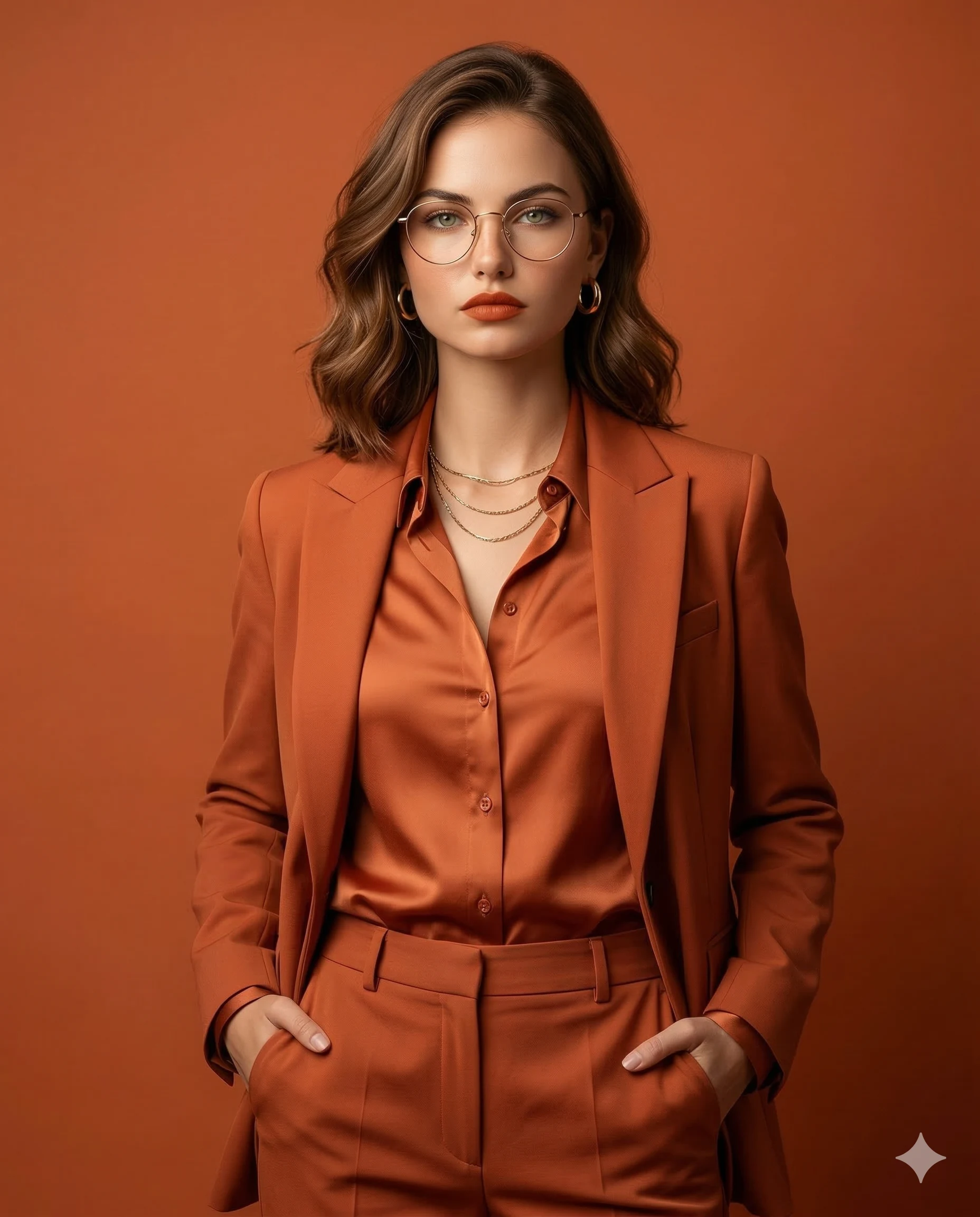 Create an ultra-high-resolution studio portrait of a polished professional person standing confidently against a terracotta-orange background. The entire scene follows a rich monochromatic color palette dominated by terracotta-orange tones, creating a cohesive and visually striking composition. Composition: Medium close-up (waist-up shot), perfectly centered in the frame with symmetrical balance and a clean, uncluttered composition that keeps the entire visual focus on the subject. Use the provided reference image to match the identity and facial features of the subject. Preserve their natural facial structure, proportions, hairline, and overall likeness. Pose: A confident, assertive power pose. The body is slightly angled to the left while the head is slightly up and turned directly toward the camera. Both hands are casually but deliberately tucked into the front pockets of the trousers. Expression: Serious, poised, and confident with intense direct eye contact toward the viewer. A composed, neutral resting expression that conveys professionalism and authority. Outfit: Monochromatic terracotta-orange styling. A tailored, structured blazer worn open, revealing a luxurious silk or satin button-down shirt underneath. The look is completed with matching high-waisted tailored trousers. Accessories: Delicate, luxurious gold wire-rimmed round-style glasses, small, thick gold hoop earrings, and two minimalist, layered gold chain necklaces with tiny pendants. Hair & Makeup: Natural hairstyle styled in soft, polished waves. High-fashion editorial makeup with smooth skin texture and matte terracotta-orange lipstick that complements the monochromatic wardrobe. Background: A smooth, seamless, solid terracotta-orange studio backdrop enhanced with a subtle vignette effect, where the edges of the background are slightly darker than the centre. This creates a gentle visual falloff that naturally draws attention toward the subject while maintaining the monochromatic colour palette. Lighting: Professional studio lighting with a directional key light positioned high on the upper-right side of the subject. The light falls diagonally across the face, illuminating the right side while creating soft sculpting shadows on the left side of the face and body. This lighting also casts a diffused shadow of the subject onto the background wall toward the left side of the frame, enhancing depth and studio realism. Gentle highlights appear on the satin shirt and hair, with natural catchlights visible in the eyes. Camera Angle: Eye-level, straight-on perspective. Technical Details: 8K resolution, photorealistic rendering, ultra-detailed skin texture and fabric sheen, razor-sharp focus on the face, captured with an 85mm portrait lens at f/2.8 for strong subject clarity and soft background separation, high-fashion editorial studio photography style. Aspect ratio: 4:5