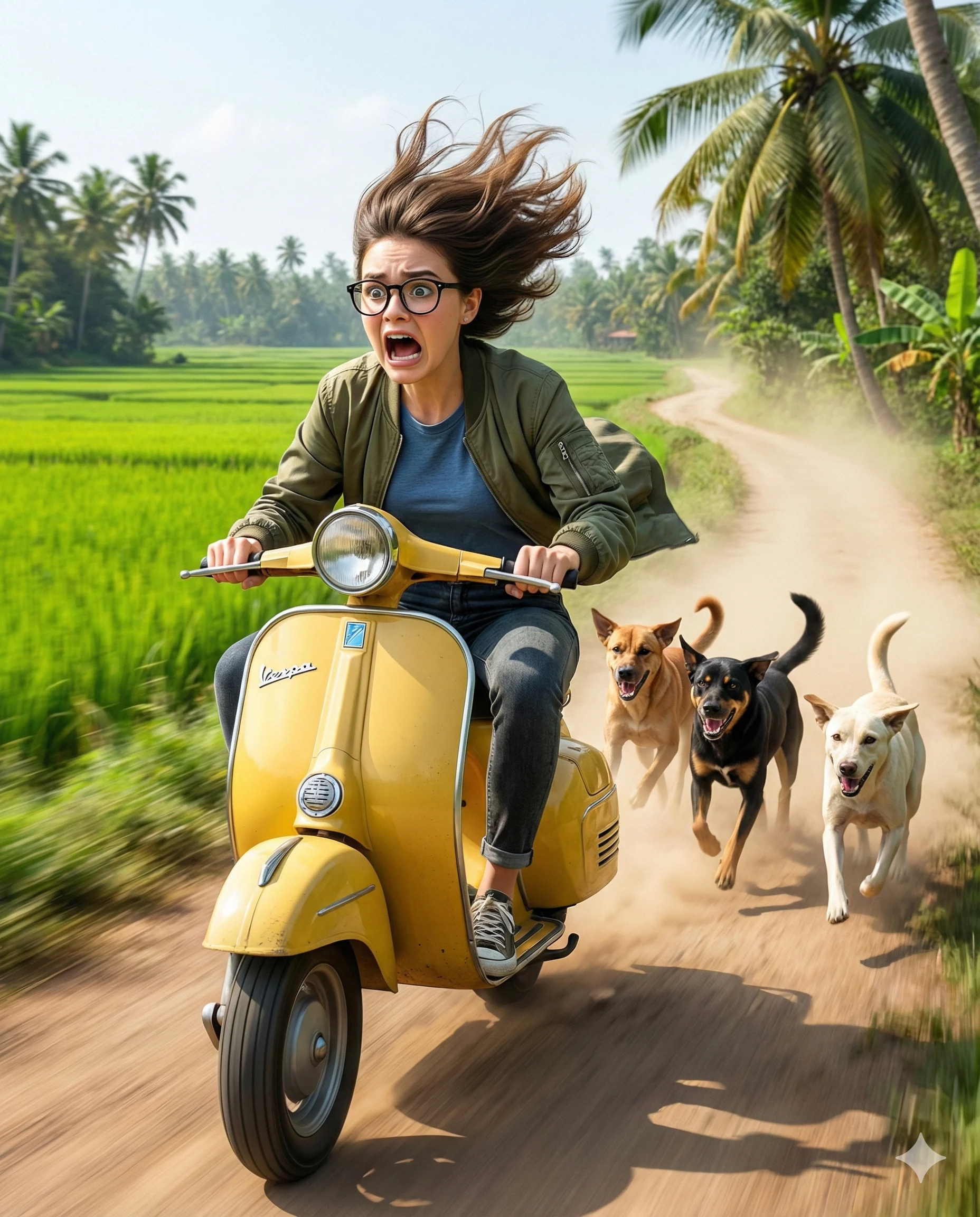Create a hyper-realistic, cinematic, surreal, humorous action scene with a caricature-style perspective. Capturing a comedic yet high-stakes chase moment in a realistic tropical rural environment with slightly exaggerated character expression. Face Match & Identity Preservation Use the provided reference image for strict face matching. Preserve identical facial structure, proportions, skin tone, hairstyle/hairline, glasses shape, and overall identity. Maintain natural skin texture; no beautification or facial alteration. Central Subject Subject is riding a vintage scooter slightly left direction of frame, while panicking intensely — mouth wide open, eyes bulging behind thick black circular glasses, eyebrows raised, wind-blown hair swept upward and backward. The subject wears an olive-green bomber jacket over a blue crew-neck t-shirt, dark denim jeans, and neutral casual sneakers, with clothing naturally flapping and pulled backward by the wind to emphasize speed. Vehicle Vintage yellow Vespa-style scooter with glossy paint reflections and chrome headlight details. Strong sense of speed and forward force. Aggressive Pursuit (Important) Three street dogs (tan, black, and white/cream) chase aggressively right behind the scooter in full sprint: bodies stretched in running stride (mid-air gallop moments) ears back, intense focus on the rider open mouths with visible teeth and tongues “attack-chase” energy, close distance, high urgency High-Speed Motion & Effects (Important) Emphasize high-speed movement with smooth cinematic motion blur: subtle motion blur on the road edges, dust trail, background palms, and distant fields keep the man + scooter sharp (hero focus), dogs mostly sharp with slight limb motion blur strong volumetric dust cloud kicked up by rear tire and dogs’ paws, forming a long trailing plume speed lines NOT cartoon lines — realistic motion blur and dust streaking Environment & Lighting Narrow winding dirt road through neon-green rice paddy fields, scattered tall coconut palm trees, bright midday sun, pale blue sky with soft wispy clouds. High-key cinematic HDR lighting with realistic shadows and crisp highlights on the scooter. Composition One-point perspective with the dirt road as leading lines toward the subject. Shallow depth of field: sharp foreground/mid-ground, softly blurred distant palms and horizon. Aspect Ratio: 4:5 vertical Style: hyper-realistic, cinematic, surreal action, caricature-style, high detail, realistic motion blur, dynamic chase storytelling