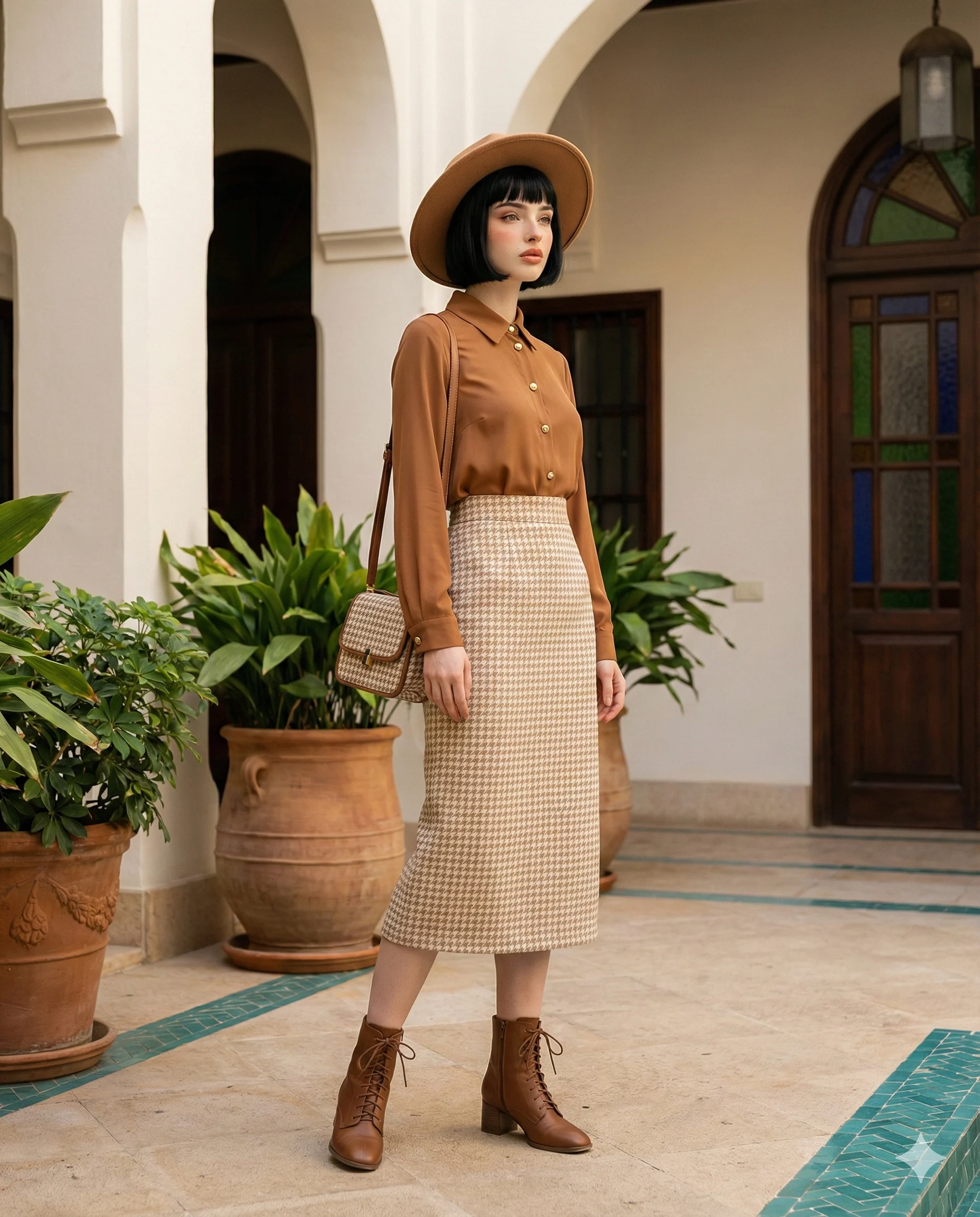 Create a full-body fashion editorial portrait of a stylish young woman standing in a Mediterranean courtyard based on image_0.png. She has fair skin, natural length, silky hair, with natural colour. Natural makeup with peach lips and soft blush. Setting: Elegant Mediterranean/Middle Eastern courtyard with off-white stucco walls, arched alcoves, wooden double doors topped with semi-circular stained glass (blue, green, red geometric patterns), terracotta planters with manicured shrubs, and beige stone tiles with vibrant teal grid accents. Wardrobe: Caramel-brown silk-like long-sleeve blouse (structured collar, slight puff shoulders, gathered cuffs, gold buttons) tucked into a high-waisted beige/cream houndstooth A-line midi skirt. Medium-brown matte leather lace-up ankle boots (low block heel), camel wide-brim felt fedora, and matching houndstooth crescent shoulder bag. Pose & Expression: Full-body, 3/4 angle stance; head slightly turned right, gazing off-camera. Neutral, serene high-fashion expression. Camera & Lighting: Slightly low angle, 85mm lens, f/2.0, ISO 100. Shallow depth of field with creamy bokeh. Soft diffused golden-hour light with gentle highlight on the right side of the face. Quality: Ultra-photorealistic 8K, hyper-detailed textures (fabric, leather, terracotta), natural skin texture (no plastic effect), cinematic color grading, fashion magazine editorial aesthetic, HDR, sharp subject focus. Aspect Ratio: 4:5