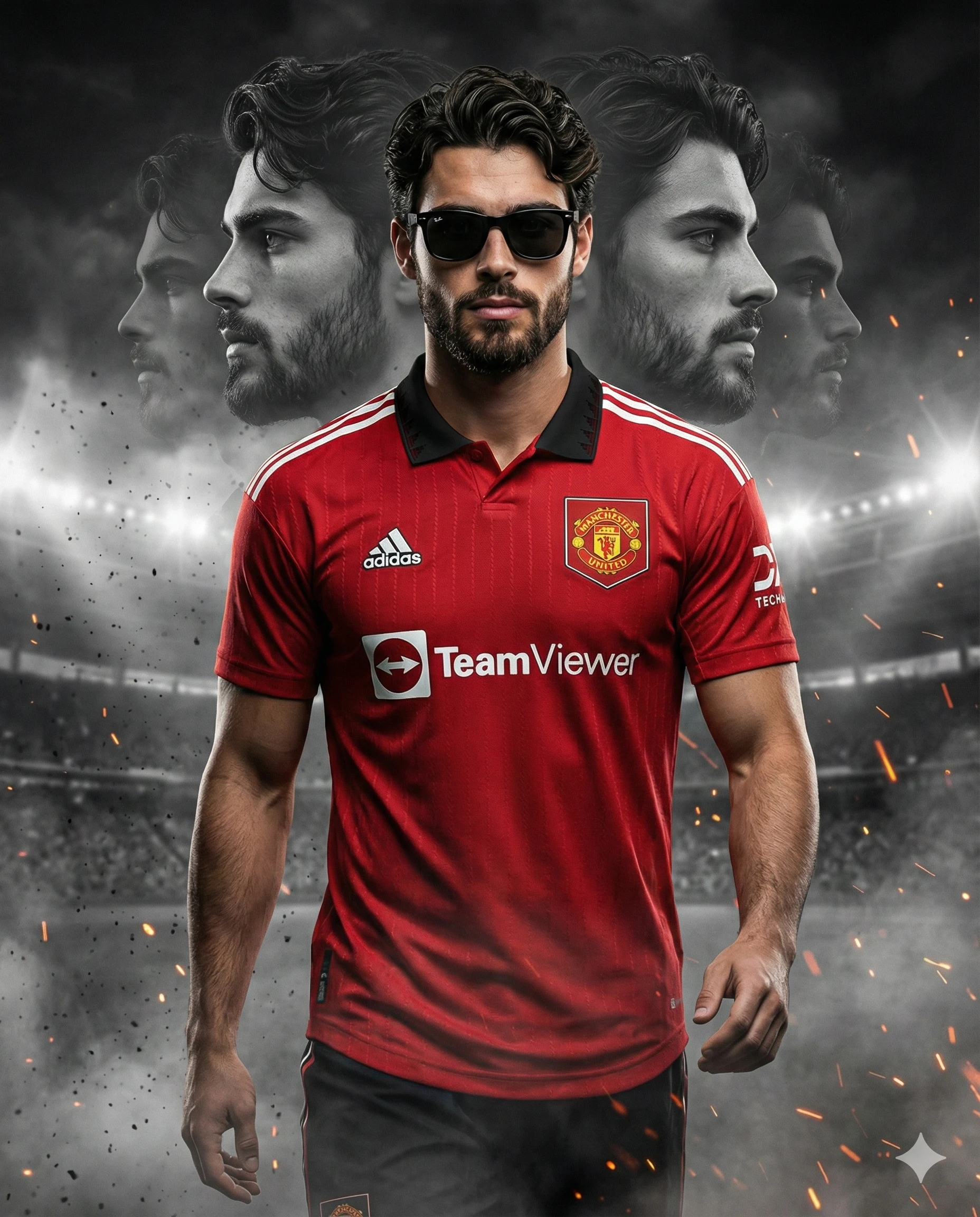 Ultra-realistic cinematic sports portrait of a confident young man walking forward in a stadium, wearing a red Manchester United football jersey with a black collar and Adidas stripes on the shoulders, logo and TeamViewer sponsor visible. He has natural wavy hair, an athletic, muscular build, and is wearing black sunglasses. Strong masculine jawline, serious, intense expression. Dramatic, moody, black-and-white background with multiple faded, transparent side-profile portraits of the same man layered behind him in a smoky, textured atmosphere. Stadium lights glowing faintly in the background, dust and fire particle effects in the air. Dark, gritty, cinematic colour grading, high contrast, sharp focus, ultra-detailed skin texture, realistic fabric wrinkles, 8K resolution, shallow depth of field, professional sports poster style, bold composition, symmetrical layout. 4:5 aspect ratio, photorealistic, hyper-detailed, dramatic lighting, volumetric fog, epic sports magazine cover look. Use the reference image for strictly facial resemblance and general appearance. Note: subject is colored, background is black-and-white.