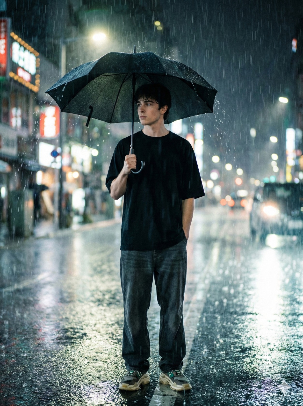 Use the reference image for 100% facial identity accuracy with no alteration to facial structure. Cinematic 3:4 vertical film-still portrait of a young man standing alone on a rain-soaked city street at night. He is positioned full-body in the center of the frame, standing still on wet asphalt, surrounded by heavy rainfall. He wears an oversized black T-shirt draped loosely over his frame, relaxed dark grey baggy trousers, and chunky sneakers slightly splashed with water. He holds a black umbrella upright with one hand at chest height, the umbrella fully open above his head, rain droplets visibly bouncing off the fabric. His other hand rests casually near his pocket, adding a natural, grounded posture. His expression is calm, introspective, and slightly distant, eyes looking off to the side rather than directly at the camera, conveying solitude and quiet resilience. The environment is a dimly lit urban street with blurred car headlights and city lights in the background, creating strong bokeh and depth separation. Wet pavement reflects streetlights and passing vehicles, forming glowing reflections beneath his feet. Heavy rain streaks are clearly visible, falling diagonally through the frame, enhancing motion and atmosphere. Lighting is moody and cinematic: a soft backlight creates a subtle halo around the umbrella and shoulders, while gentle side lighting defines facial features without harsh contrast. Color grading is slightly desaturated with cool blue-grey tones, cinematic contrast, and a filmic look. Shallow depth of field isolates the subject sharply against a softly blurred background. Shot on a cinematic lens (35–50mm look), eye-level perspective, natural proportions, realistic skin texture, film grain, atmospheric rain haze, emotional tone focused on solitude, introspection, and calm strength in the middle of a storm.