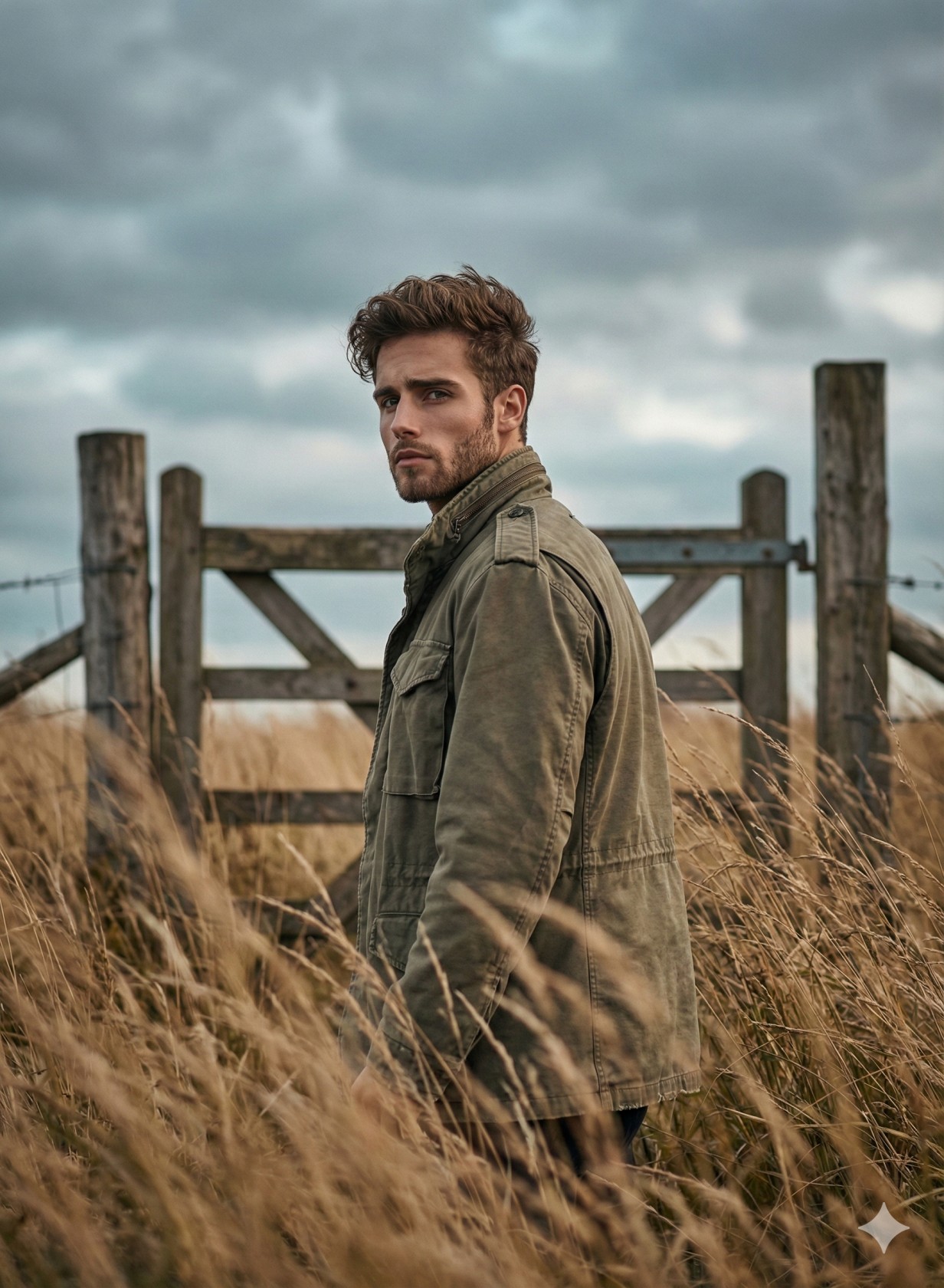 Use the uploaded reference image as the absolute and locked facial identity source. The face must remain 100% identical — no changes to facial structure, proportions, skin texture, beard shape, jawline, nose, lips, or eyes. Identity accuracy is critical. Create a rugged, cinematic portrait of a solitary man standing waist-deep inside tall, dry, wind-swept grass in an open rural field. The grass is golden-brown and straw-like, uneven in height, naturally bent and flowing with the wind. Foreground grass partially overlaps the frame, softly blurred, creating strong depth and a natural, immersive feel. The subject stands slightly left of center, captured in a medium shot (waist to chest level). His body faces away from the camera, while his head is turned back over his left shoulder, looking directly at the viewer with a serious, intense, and contemplative expression. His posture is relaxed yet grounded, conveying quiet strength and introspection. He has neatly styled dark hair, a well-groomed dark beard, a strong jawline, and sharp, focused eyes. He wears a muted olive-green rugged field jacket, made of thick outdoor fabric, slightly worn and textured, with a natural fit (not tailored). The jacket blends organically with the earthy environment and reinforces a raw, masculine, outdoor aesthetic. Background & Environment Behind him, positioned centrally in the background, stands an old, weathered wooden gate or board structure, framed by two tall, rough wooden posts. The wood appears aged, cracked, and darkened by time and weather. The structure feels abandoned and symbolic — like a boundary, passage, or forgotten entrance. It is slightly out of focus, ensuring the subject remains dominant while adding narrative depth. The sky is filled with heavy, dramatic overcast clouds, layered in cool grey and slighty blue tones. The clouds are thick and dense, creating a moody, cinematic atmosphere without visible sunlight. Lighting & Color Tone Lighting is soft, diffused, and natural, coming from the cloud cover above. No harsh highlights or strong shadows — only gentle contrast, subtle facial highlights, and smooth shadow falloff across the jacket and grass. Color grading is film-inspired: Warm earthy browns and golden tones in the grass Muted olive and neutral tones on the subject Cool, desaturated greys and blues in the sky The overall palette feels natural, grounded, and cinematic, with a calm but dramatic mood. Camera & Technical Details Lens: 85mm Aperture: f/1.8 Shallow depth of field with strong subject separation Soft bokeh in foreground grass and background Ultra-sharp facial details with realistic skin texture Natural perspective compression High dynamic range, balanced exposure Style & Mood Cinematic realism, moody and introspective tone, film-grade color grading, atmospheric depth, natural textures, modern movie-poster aesthetic, ultra-high resolution, professional photography quality.
