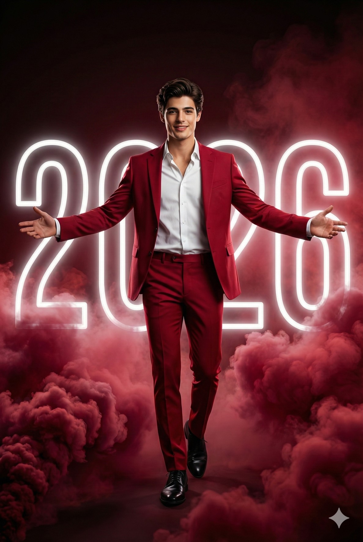 Use the uploaded image as visual reference. Create a cinematic, ultra-realistic digital artwork of a confident young man walking forward toward the camera, set in a dramatic New Year 2026 environment dominated by deep red tones. Subject & Pose A young man with a well styled hair Warm, confident smile, looking directly at the camera Captured mid-stride, one leg stepping forward naturally Arms extended wide at shoulder height, palms open in a welcoming, powerful gesture Upright posture, calm confidence, commanding presence Outfit Tailored two-piece suit in rich crimson red Unbuttoned red blazer with clean notch lapels Crisp white dress shirt underneath, top buttons open, no tie Matching red trousers with natural movement creases around knees and thighs Polished black leather dress shoes with subtle reflections Smoke & Atmospheric Effects (VERY IMPORTANT) Thick, voluminous red smoke clouds fill the lower half of the scene Smoke appears dense, layered, and cinematic, not flat or fog-like The smoke has visible texture and depth, with soft billows, curls, and rolling edges Clouds of smoke swirl around the subject’s legs and feet, partially obscuring the ground Smoke density increases toward the bottom of the frame and gradually thins upward Subtle motion in the smoke, as if slowly drifting or expanding outward Color variation inside the smoke: deep crimson, dark maroon shadows, and glowing red highlights Light from the neon “2026” softly diffuses through the smoke, creating glowing edges and soft halos The smoke enhances depth separation between foreground (subject), mid-ground (legs), and background Overall effect feels dramatic, stage-like, powerful, and cinematic, similar to high-end movie posters Background & Lighting Massive glowing neon numerals “2026” behind the subject White neon outline, rounded sans-serif style, resembling illuminated tubing The subject partially blocks the center of the numbers, adding realism and depth Strong backlight from the neon creates a soft rim-light around shoulders and arms Soft frontal lighting keeps face, suit texture, and expression clearly visible Dark gradient background transitioning from black to deep red Color Tone & Mood Dominant palette: crimson red, deep black shadows, glowing white highlights High contrast, glossy, cinematic color grading Mood is bold, celebratory, powerful, and optimistic Symbolizes confidence and stepping into the future (New Year 2026 energy) Composition & Quality Full-body, centered composition Vertical portrait orientation Ultra-sharp focus on subject, slightly diffused background Premium digital art style, cinematic realism High detail, professional finish Aspect Ratio: 2:3 (vertical)