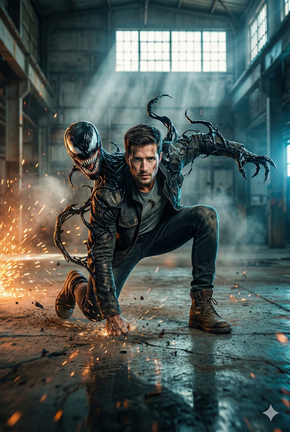 Create a 16K ultra-realistic, cinematic Hollywood action scene using the uploaded reference image of the same young man (100% exact facial match, do not alter face shape, skin tone, facial structure, or identity in any way). The man is captured in a dynamic crouched superhero landing pose, one knee bent forward, one hand firmly pressed against the concrete floor, the other arm extended backward for balance. His expression is intense, focused, and fearless, with sharp eyes locked forward. He wearing a dark fitted jacket over a neutral t-shirt, slim dark jeans, and rugged boots, all slightly worn for realism. From his back, a Venom-like symbiote entity violently erupts, partially merged with his body. The symbiote appears glossy black, organic yet metallic, with long twisting tendrils and sharp, claw-like extensions spreading outward. A semi-formed monstrous head emerges over his shoulder, featuring razor-sharp teeth, an exaggerated grin, wet reflective textures, and glowing white eyes, creating a menacing presence. The symbiote feels alive, mid-motion, as if expanding and reacting to the environment. Environment & Setting The scene takes place inside a large abandoned industrial warehouse with high ceilings, steel beams, tall grid windows, and concrete flooring. The space is filled with cinematic fog and dust particles floating in the air. Sparks and debris scatter near the ground, suggesting recent impact or action. Lighting & Color Tone Strong cinematic lighting contrast: Warm orange sparks and firelight from the left Cool blue rim light and practical lights from the right Volumetric light beams cut through the fog from overhead windows Subtle lens flares, motion blur, and light streaks enhance action intensity Realistic reflections on the wet concrete floor beneath the character Film-grade color grading with teal-orange Hollywood tone Camera & Style Low-angle, wide cinematic shot Shallow depth of field with sharp subject focus Hyper-detailed textures (skin pores, fabric fibers, symbiote surface) Photorealistic CGI blended seamlessly with live-action realism Subtle film grain for a blockbuster movie look Quality & Constraints Ultra-detailed, photorealistic, cinematic, high contrast, IMAX-level realism, dynamic motion energy. Create Image in 4:5 Aspect ratio. Do NOT change the face or identity. Face must remain exactly the same as the reference image. No exaggeration or stylization of facial features.