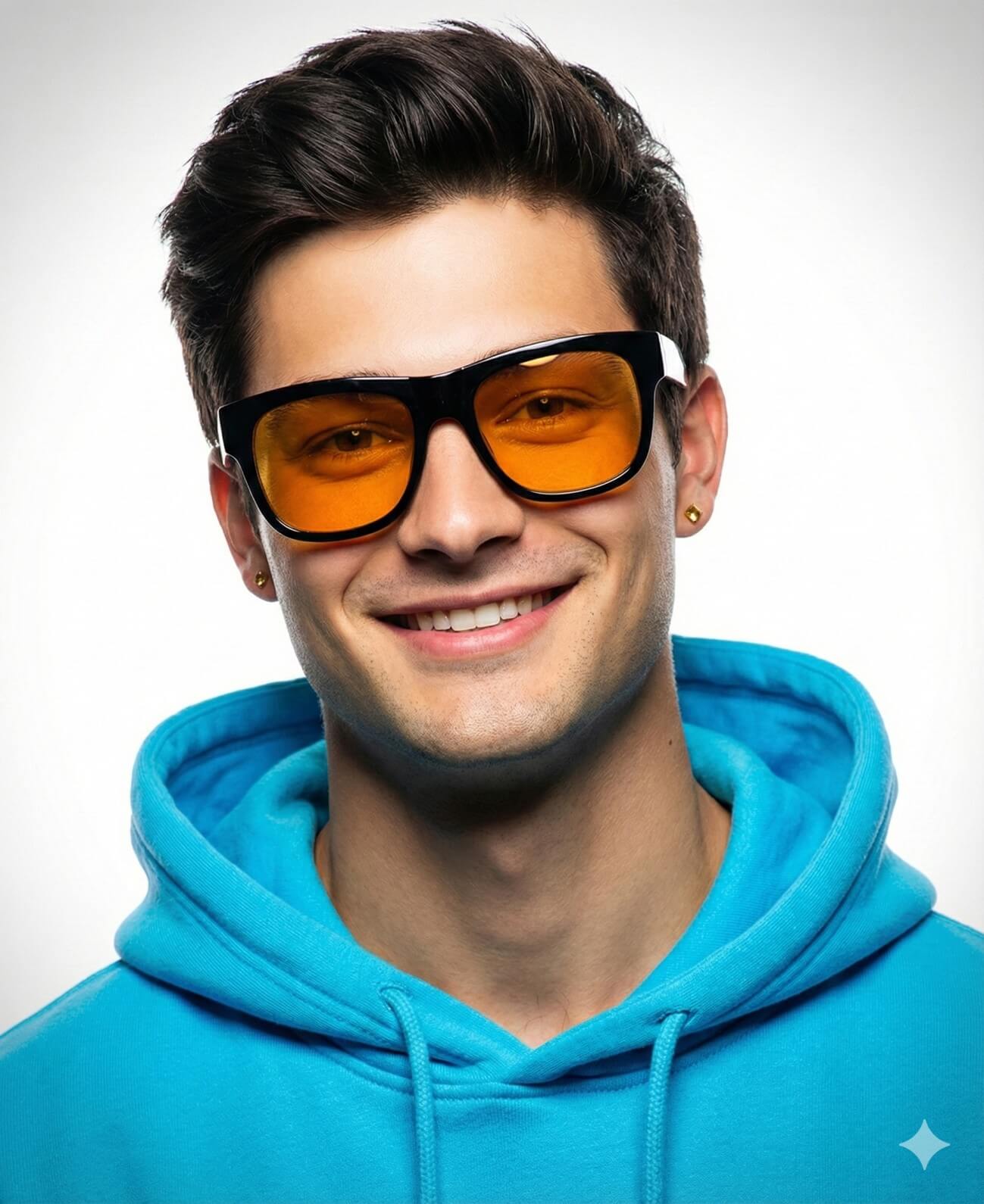 Create a minimal editorial portrait of a stylish smiling man (same face as reference) against a bright white backdrop framed by soft vignette edges, wearing oversized black sunglasses with orange lenses, a neon blue hoodie, and small gold earrings. Bright studio lighting, minimal light background, Modern fashion editorial photography, clean and vibrant style. Vogue cover style. Rim lighting outlines his face for an 8K studio-quality, HDR minimalist aesthetic.