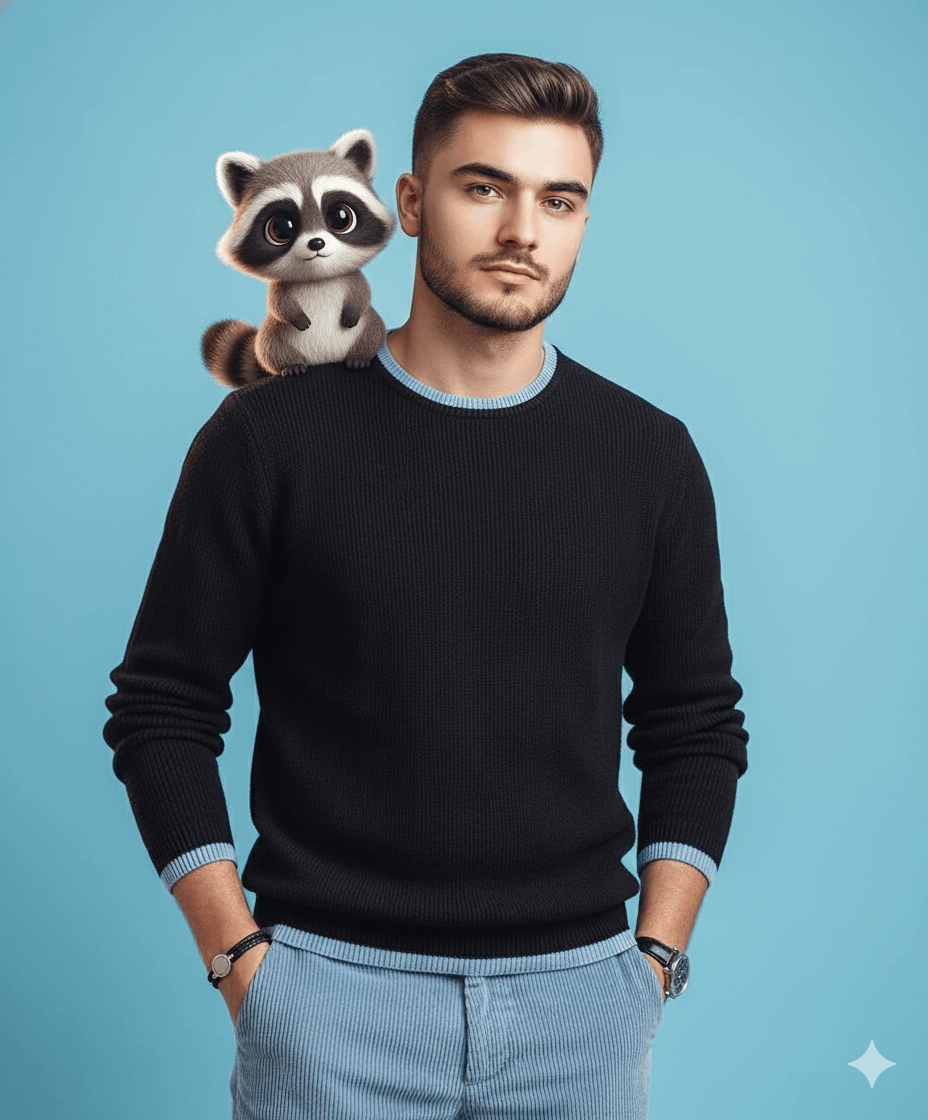 Subject (Man): A hyper-realistic, photorealistic medium shot of a man. He has stylishly swept-back dark hair and a neatly trimmed dark beard and mustache. He is wearing a black crew-neck sweater featuring a distinct light blue ribbed collar trim, paired with light blue corduroy pants. He stands with both hands casually in his pockets. On his left wrist, a dark braided bracelet with a silver oval charm; on his right wrist, a classic silver watch with a black strap. Subject (Creature): Perched on his right shoulder is a small, cute, stylized cartoon raccoon. The raccoon has large, expressive black eyes, prominent black mask markings, white fur around the face, and greyish-brown body fur. It looks directly at the viewer. Style & Contrast: A "mixed media" aesthetic. The man is rendered in 8k hyper-realism, while the raccoon is rendered in a distinct animated/cartoon style, creating a deliberate "Photoshop logic" contrast where the cartoon character appears as a charming, exaggerated companion in a real world. Lighting & Background: Cinematic studio lighting, soft and even, originating from the front-right. The lighting highlights the knit texture of the sweater and the ribs of the corduroy. The background is a clean, solid, vibrant light blue studio backdrop. Technical Specs: Shot with a 50mm standard lens, sharp focus, highly detailed, professional photography.