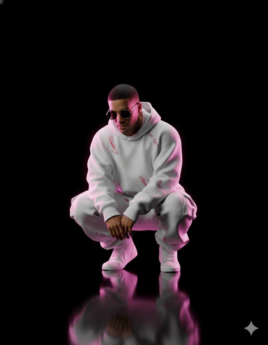 Create A detailed, hyper-realistic CGI rendering of a lone figure (image uploaded), possibly a man, with dark hair, as he looks introspectively downwards. He is in a low squatting pose, centered in the frame. He wears round sunglasses and an oversized, hooded white sweatshirt and baggy white cargo pants, both with subtle distress and faint red or pink abstract markings, paired with pristine white high-top sneakers. The setting is a minimalist, pure black void with a perfectly glossy, dark, reflective floor that mirrors the figure sharply. Dramatic low-key lighting illuminates the subject from above and slightly in front, creating soft highlights on his white attire. A powerful, vibrant neon pink and magenta rim light sharply outlines his entire form from behind and the sides, casting an intense, glowing pink aura onto the reflective floor around his reflection. The overall mood is melancholic and mysterious, blending urban streetwear with a conceptual, isolated aesthetic. Ensure sharp focus, clean lines, and no distracting elements, blurry areas, or poor reflections.