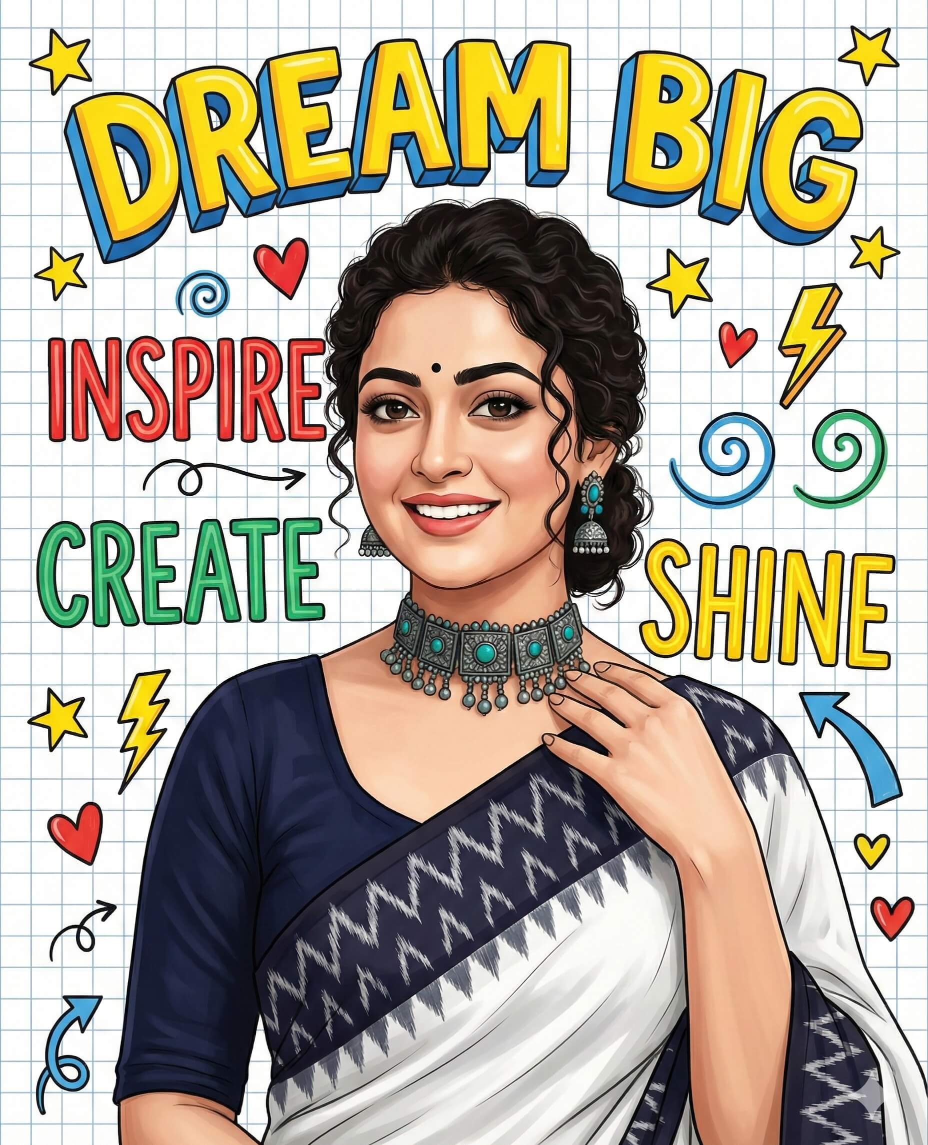 Use the uploaded photo as a face reference and create A high-quality, semi-realistic digital illustration of a smiling young Indian woman with a radiant expression. She has dark curly hair pulled back into a messy bun with loose tendrils framing her face, a small black bindi, and distinct dark eyebrows. She is wearing a dark navy blue half-sleeve blouse and a white saree with a dark ikat-patterned border. She wears a chunky oxidized silver and turquoise choker necklace with hanging beads and matching earrings. Her left hand is gently raised, resting on her upper chest/collarbone area. The background is a white grid notebook paper texture filled with colorful, hand-drawn motivational typography and doodles. Key elements include the text "DREAM BIG" in yellow and blue 3D bubble letters, "INSPIRE" in red, "CREATE" in green, and "SHINE" in yellow. Surrounding the woman are doodles of yellow stars, red hearts, lightning bolts, blue swirls, and arrows drawn in a marker style. Photorealistic style. The image should be in a tall, vertical portrait format corresponding to a 4:5 aspect ratio.