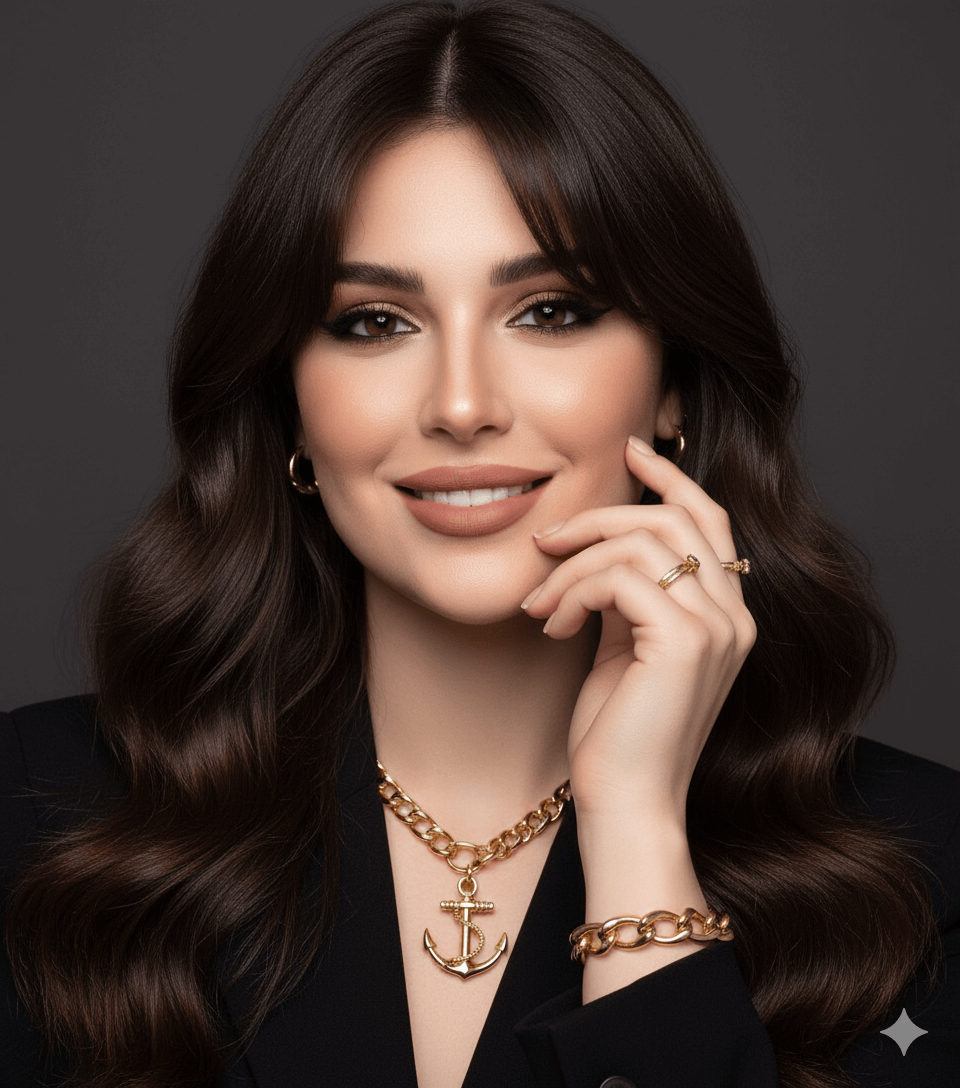 Create a studio-quality portrait shot in front of a dark, plain background. The woman in the reference picture is a well-groomed woman with dark hair. She is looking at the camera smiling. Her hair appears dark brown, thick, wavy, and voluminous. Her makeup is in the foreground: Distinct eyeliner and smoky-toned eye makeup. She has matte, coffee-nude toned lipstick on her lips. Her skin makeup looks contoured and radiant. The model is wearing eye-catching gold-colored jewelry: A necklace with an anchor figure on a thick chain around her neck. A thick, link-chain style bracelet on her left wrist. Small, elegant rings on her fingers. Small, round hoop earrings in her ear. Pose: The model's left hand is gently touching the lower part of her cheek, and gold-colored jewelry is visible on this hand as well. Her upper clothing looks like a black outfit (probably a jacket or blouse). Do not change the woman's face.