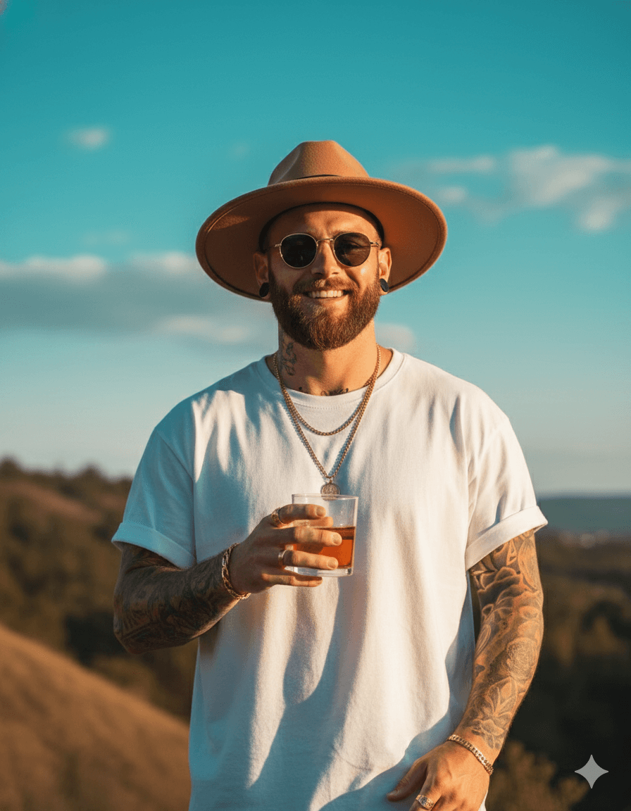 Create an ultra-realistic cinematic outdoor lifestyle portrait during golden hour on a natural hillside. Composition is centered and balanced in a medium shot (waist to above head), with no cropping of the hat and clean negative space around the subject. The subject stands facing forward with a relaxed posture, shoulders slightly open, holding a clear glass with amber liquid in one hand at chest level. Expression is warm and genuine with a natural smile, conveying confidence and ease. Gaze is directed toward the camera through round dark sunglasses. Outfit includes a tan wide-brim fedora hat, oversized white crew-neck t-shirt with rolled sleeves, visible tattoo sleeves on both arms, stretched ear piercings, layered gold chain necklaces with a circular pendant, rings, and bracelets. Background features a softly blurred hillside landscape with warm earthy tones and distant terrain, under a clear teal-blue sky with subtle clouds. No people, no distractions in foreground or background. Lighting is strong golden-hour directional sunlight from front-right, casting warm highlights on the face and outfit, with soft shadows and subtle rim light around the hat and shoulders. Skin texture must remain natural with visible pores — avoid plastic or CGI look. Camera is eye-level, shot with a portrait lens (50mm look), shallow depth of field, sharp focus on subject, smooth background bokeh. Ultra-high resolution, highly detailed, realistic photography, cinematic color grading, no text, no watermark. Aspect ratio 4:5.