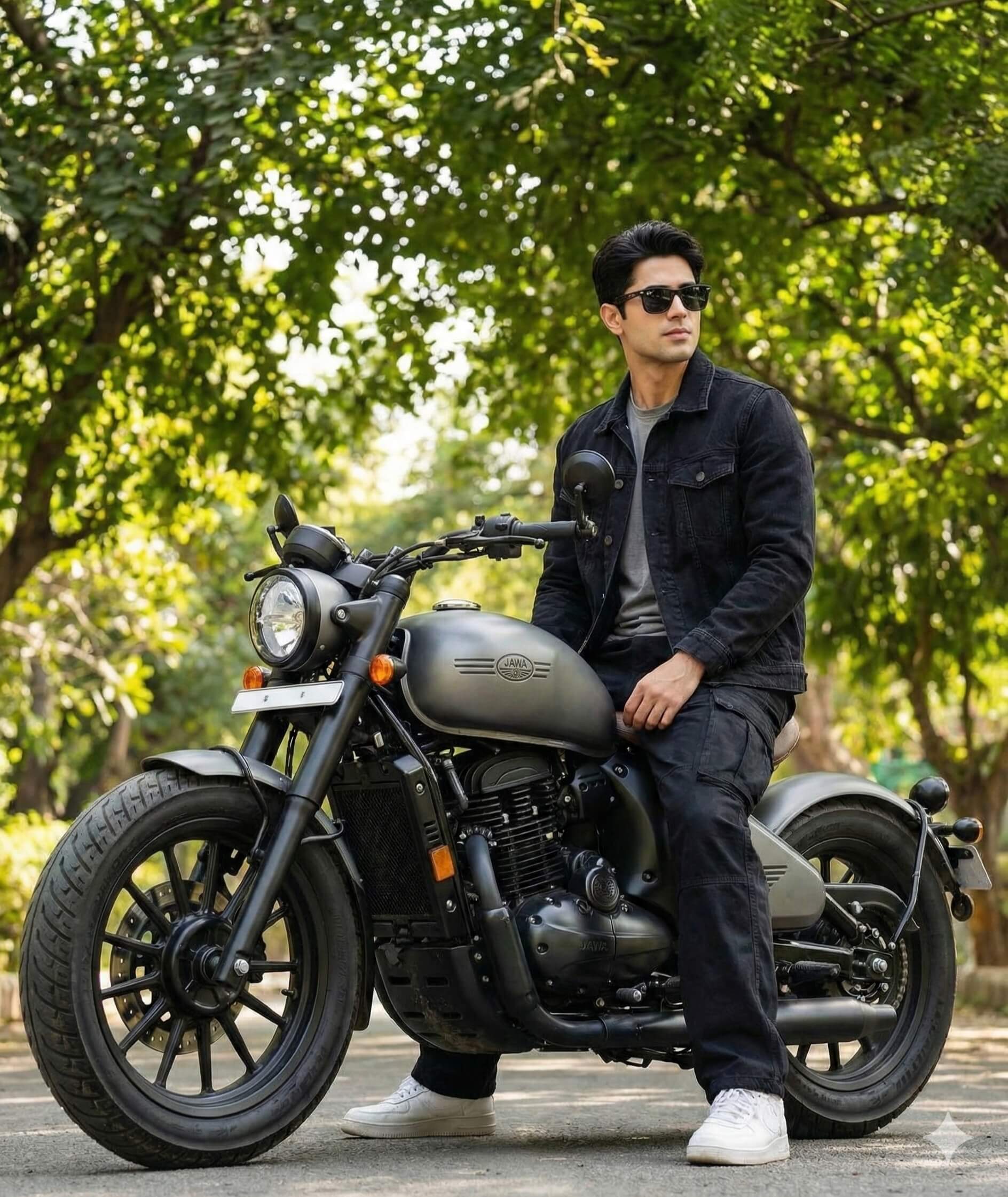 Ultra-realistic full-body shot of a stylish young man sitting confidently with a matte grey jawa 42 bobber motorcycle under lush green trees. He has short black hair, black sunglasses, black denim jacket over a T- shirt, baggy black cargo pants, and white sneakers. One leg on the ground, and other leg on brake or gear, Id looking *O the right. The bike has bold wide tires, dynamic retro design, black frame, and a jawa on the fuel tank."A sleek modern bobber-style dont change my face Use the face from the uploaded reference image and preserve the same facial features - do not alter the face.