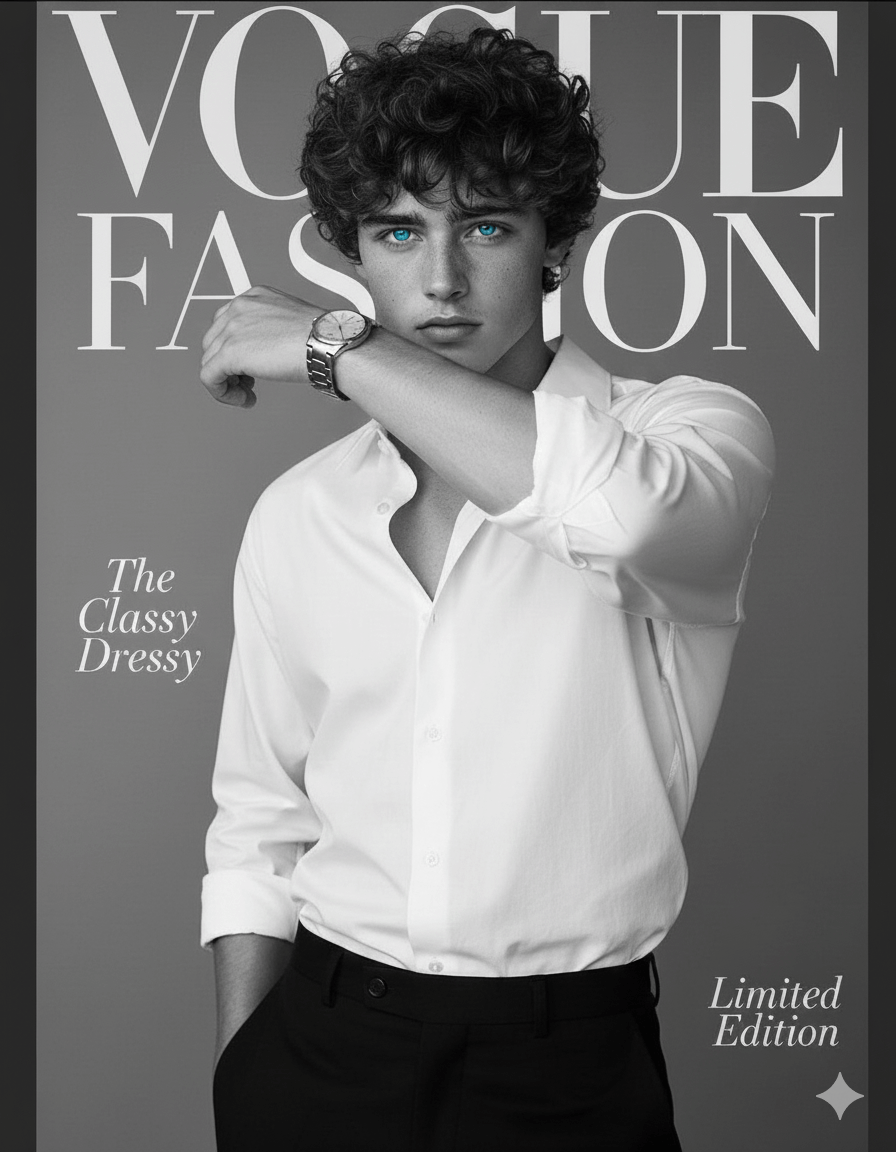 Ultra-high-resolution black-and-white Vogue-style fashion editorial magazine cover featuring a young male model standing in a confident, composed pose. The model has natural dark hair with natural texture and soft movement. His facial structure is sharp and youthful, with piercing blue eyes that remain subtly color-accented against the monochrome palette, drawing immediate focus to his gaze. Expression is calm, serious, and fashion-editorial—emotionless yet magnetic. Pose & Body Language: The model faces the camera frontally. The model’s left elbow is raised horizontally across the half of the chest, bent at approximately a 60-degree angle, with the forearm crossing just below the chin and partially obscuring the lower face and neck. The elbow points outward toward the left side of the frame, creating a strong editorial line. The wrist is subtly rotated outward so the metallic wristwatch is fully visible and intentionally showcased, positioned the left side of the frame. The hand remains relaxed, fingers loosely curled, not clenched. This pose feels deliberate, elegant, and fashion-forward, emphasizing attitude and luxury styling rather than motion. The right arm hangs naturally downward, with the right hand placed inside the trouser pocket, reinforcing a relaxed yet confident Vogue editorial stance. Outfit & Styling: He wears a crisp white button-down shirt, lightweight fabric, slightly loose fit, with the top buttons undone for effortless sophistication. Sleeves are rolled neatly to mid-forearm, exposing the wristwatch. The shirt is tucked cleanly into tailored black dress trousers with a smooth matte finish. Overall styling is minimalist, timeless, and luxury-oriented—classic “classy dressy” fashion. Lighting & Texture: Soft, controlled studio lighting with gentle contrast—highlights on cheekbones, nose bridge, and shirt folds; subtle shadow definition along jawline and curls. Skin texture remains natural with visible pores and smooth tonal transitions. The lighting enhances fabric texture without harsh reflections. Background & Composition: Minimalist flat gray studio background, evenly lit, with no visible texture or environment distractions. Clean negative space allows typography to dominate. The subject is centered slightly right of frame, leaving space for magazine text overlays. Typography & Magazine Layout: Large, bold “VOGUE” masthead at the top in high-fashion serif typography, white lettering, partially overlapped by the model’s hair and head for depth. Below it, “FASHION” appears in tall, elegant serif capitals, spaced widely across the upper background. On the left side, smaller italic serif text reads “The Classy Dressy”, placed mid-frame. On the lower right corner, refined serif text reads “Limited Edition”, accompanied by a small minimal diamond/star icon. All text is white or off-white, cleanly aligned, magazine-accurate placement. Overall Style & Quality: Luxury editorial aesthetic, Vogue Paris / Vogue Italia inspired. High contrast black-and-white photography with selective eye color pop. 8K ultra-detailed, cinematic sharpness, professional fashion photography, premium magazine cover realism, timeless elegance, modern masculine couture mood.