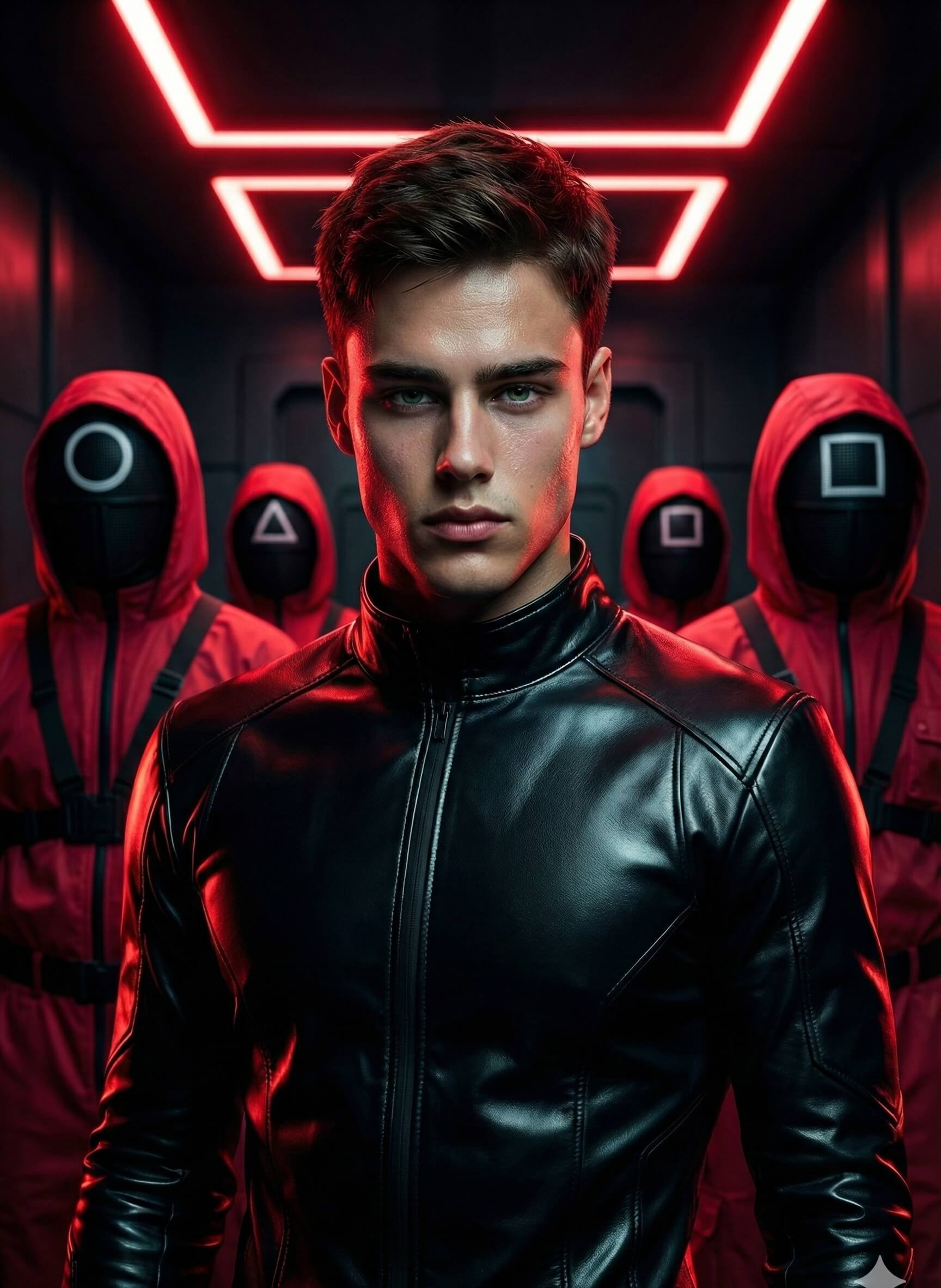 “Use the face from the reference image, same hairstyle, same skin tone, same facial structure.” “Create a dramatic cinematic portrait of a young man standing in a dark futuristic room illuminated with red neon lights. He is wearing a sleek black leather tactical suit with sharp seams and a high collar. His expression is intense and confident. Behind him, several masked guards stand in red hooded jumpsuits with black face masks displaying white geometric symbols (circle, triangle, square). The atmosphere is mysterious, tense, and high-contrast like a dystopian survival game. Ultra-detailed skin texture, realistic lighting, sharp focus, glossy leather material, deep shadows, 8K quality, moody sci-fi tone.”