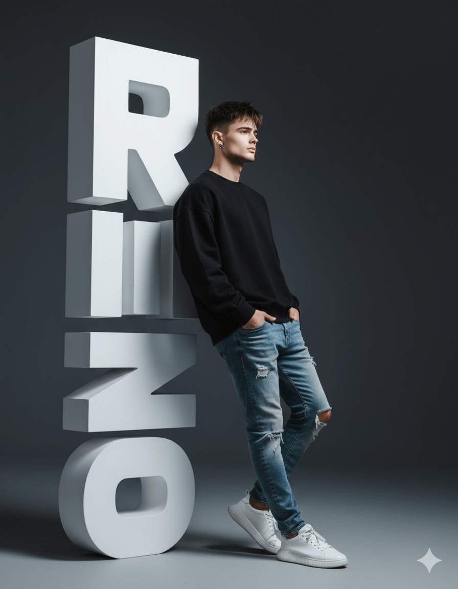1. Subject and Identity Subject: A man, approximately 29 years old, in a relaxed yet confident posture. Identity Source: [Use the uploaded face image as the facial reference, maintaining 100% facial detail and likeness.] Pose: Full body shot from the side (profile), leaning comfortably against the large white sculpture. Most of the weight is resting on one leg. Both hands comfortably in trouser pockets, creating a natural and effortless look. Expression: Poignant, thoughtful, and peaceful. The head is slightly tilted as the subject peers through the frame. 2. Wardrobe and Style Outfit: Comfortable, oversized black round-neck sweatshirt (no logo, soft cotton fabric) paired with ripped jeans. Footwear: White sneakers with visible shoelaces and distinctive, sculpted soles. Accessories: Earring piercing. Style: Monochrome, minimal, and contemporary streetwear/casual fashion. 3. Setting and Environment Location: Modern, high-end studio environment. Background: Clean and simple dark grey tones. Prop/Sculpture: A large, 190 cm tall white sculpture spelling the word "RENO" (in a bold, architectural font). The subject is comfortably leaning against this sculpture. 4. Technical and Aesthetic Details Angle: Low-angle shot (worm's-eye view) to emphasise height, presence, and the grandeur of the "RENO" sculpture in the background. Composition: Cinematic and natural proportions. The framing resembles that of a classic portrait lens, with an approximate focal length of 85 mm. Lighting: Controllable studio lighting. The lighting should strongly and constantly highlight the subject's figure, while casting a soft, directional shadow on the large white sculptural letters behind the subject. Overall Mood/Vibe: Cinematic, Editorial, and Modern. Combining casual streetwear with distinctive architectural characters. Realism: Ultra-realistic, hyper-detailed photography (100% realism).