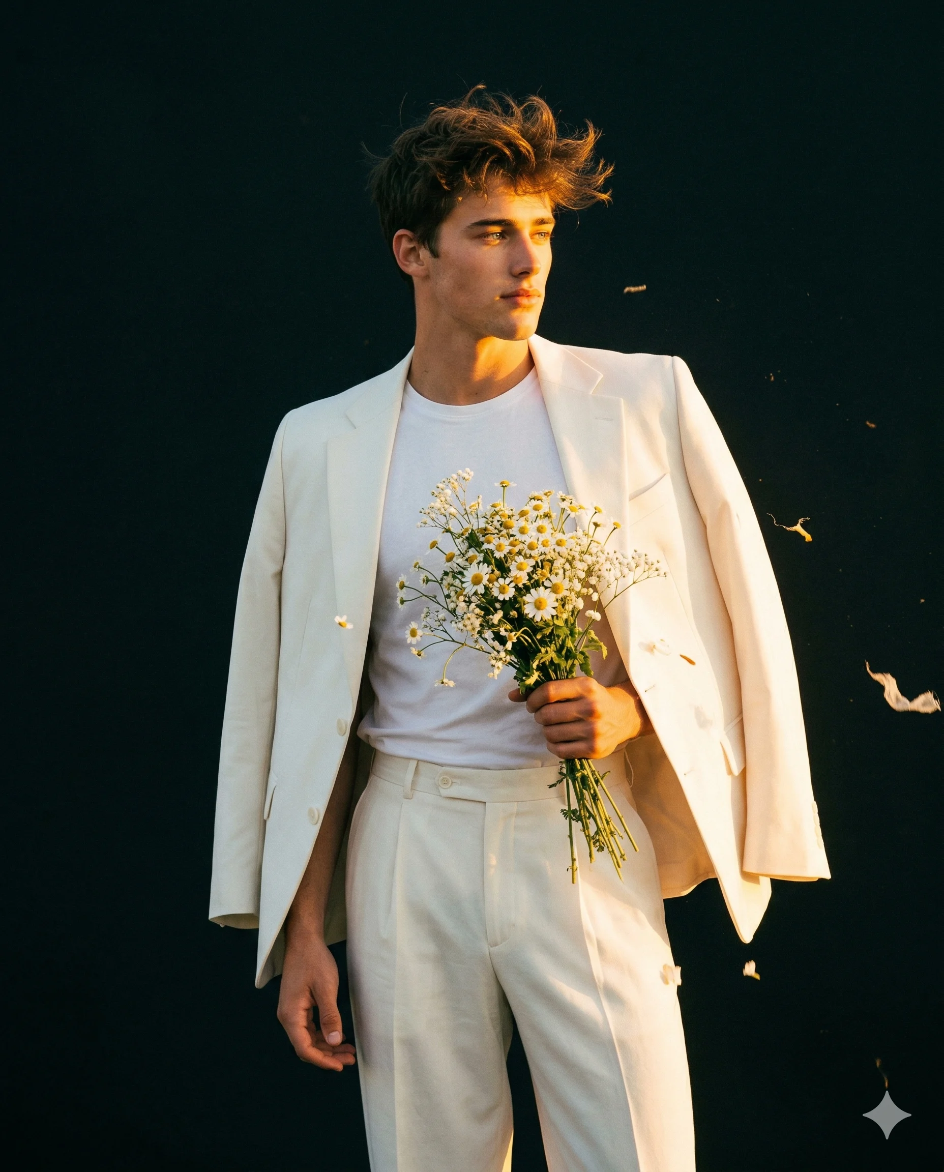 Create a vintage, grainy yet bright cinematic portrait with a soft 90s film aesthetic. Composition & Framing: Medium full shot (above knees to slightly above head), centered with balanced negative space. No head crop. Pose: Relaxed standing posture. Right hand holding a small bouquet of white and yellow wildflowers at chest level. Left hand resting naturally by the side. Expression & Gaze: Calm, dreamy expression with an off-camera gaze toward the right. Outfit: Cream/ivory tailored suit with blazer draped over shoulders, white t-shirt, pleated trousers — soft retro elegance. Lighting: Warm golden hour sunlight from the side, creating a natural glow on the face. Bright highlights with soft shadows. Style & Texture: Vintage film look — subtle grain, light film noise, slight fade, warm tones, soft contrast, nostalgic 90s aesthetic, slightly overexposed highlights. Background & Details: Void-like matte black(#051414) studio background with floating petals/particles and gentle wind movement in hair. Camera & Quality: 85mm lens, shallow depth of field, soft focus edges, cinematic color grading, film-like imperfections. Aspect ratio 4:5