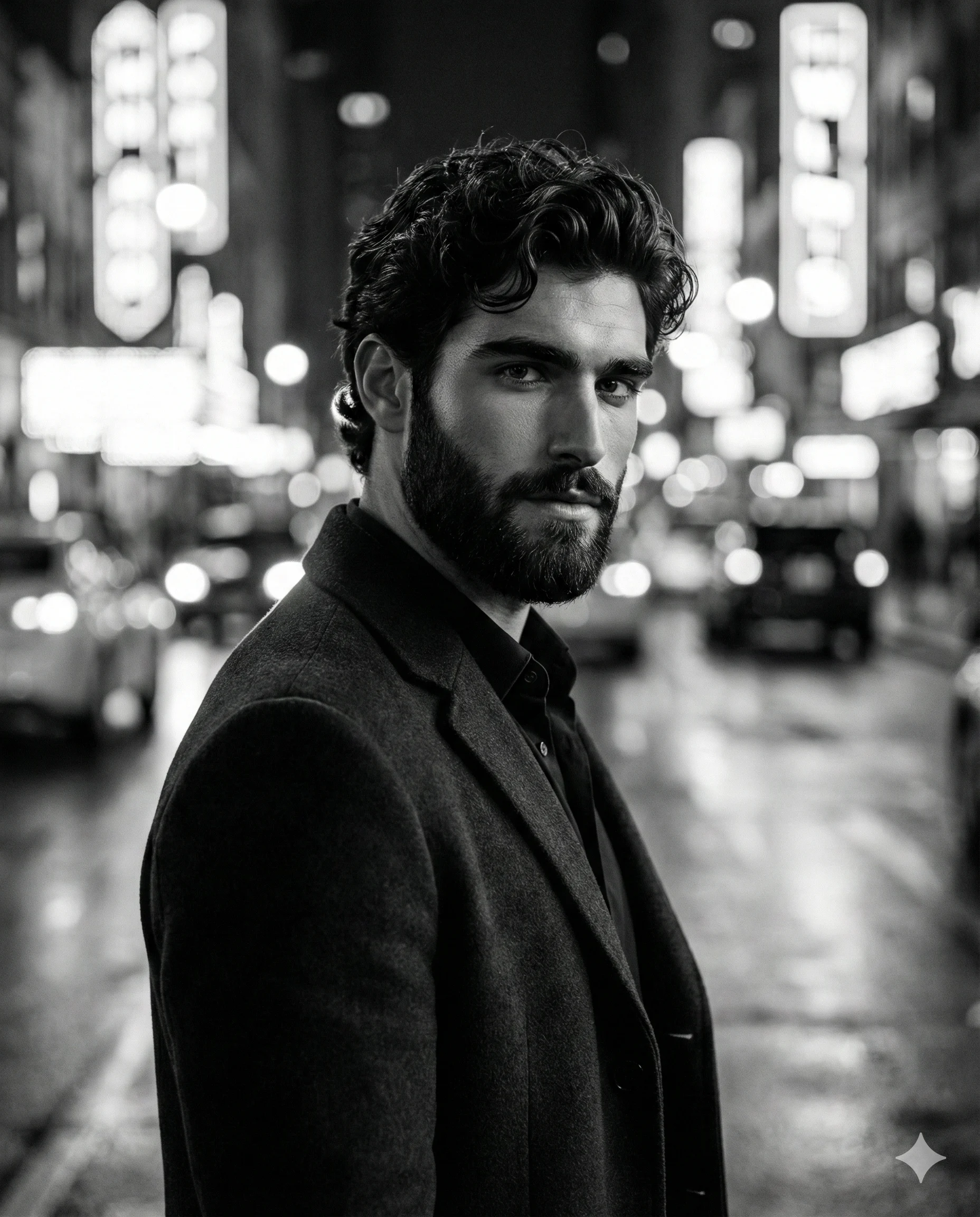 Create an 8K ultra-realistic cinematic portrait of a man. Use the attached reference image for exact facial structure and likeness accuracy. Preserve identical facial proportions, bone structure, jawline geometry, eye shape, brow structure, and hairstyle. Maintain strong likeness, fidelity, and accurate facial proportions. Subject Description A ruggedly handsome man standing on the roadside of a city street at night. Natural hair with subtle wind movement and realistic texture Deep-set, intense eyes with defined brows Serious, brooding, confident expression maintaining eye contact Editorial luxury energy He wears a tailored black wool overcoat with structured shoulders and notch lapels over a dark button-down shirt with a slightly open collar. The matte wool texture subtly contrasts with the faint sheen of the shirt fabric. Pose & Composition Subject occupies 60-70% of the frame Medium Close-Up (MCU) – framed from chest/shoulders upward Three-quarter body angle facing the right side of the frame. Head turned back over left shoulder Piercing direct eye contact with camera Eye-level camera position Shallow depth of field Creamy background separation Lighting (Cinematic Film Noir) High-contrast chiaroscuro lighting inspired by classic film noir. Soft directional key light coming from the right side of the frame, illuminating the half side of the face. Sculpted cheekbone highlights Defined nose bridge Subtle rim light on hair Right side fading into deep dramatic shadow Rich blacks, luminous highlights Cinematic dynamic range Environment Night urban city street with many lighting objects. Glowing vertical neon signs (not overexposed) Blurred car silhouettes and lights on the road Circular streetlight bokeh Wet pavement reflections Extremely shallow depth of field Technical Specifications 8K ultra-detailed resolution Hyper-realistic skin texture Visible pores and natural micro-texture Individual hair strand detail Razor-sharp focus on face 85mm lens f/1.4 aperture HDR tonal depth Professional editorial photography Soft cinematic film grain Black and white color grading Deep contrast Photorealistic lighting physics Parameters Aspect Ratio: 4:5 Resolution: 8K Style: Cinematic realism Negative Prompt (Important) Overexposed background, blown highlights, clipped whites, neon overload, excessive bloom, HDR halo effect, artificial light spill, washed-out lighting, oversaturated highlights, high exposure, white rectangular artifacts, unrealistic glow.