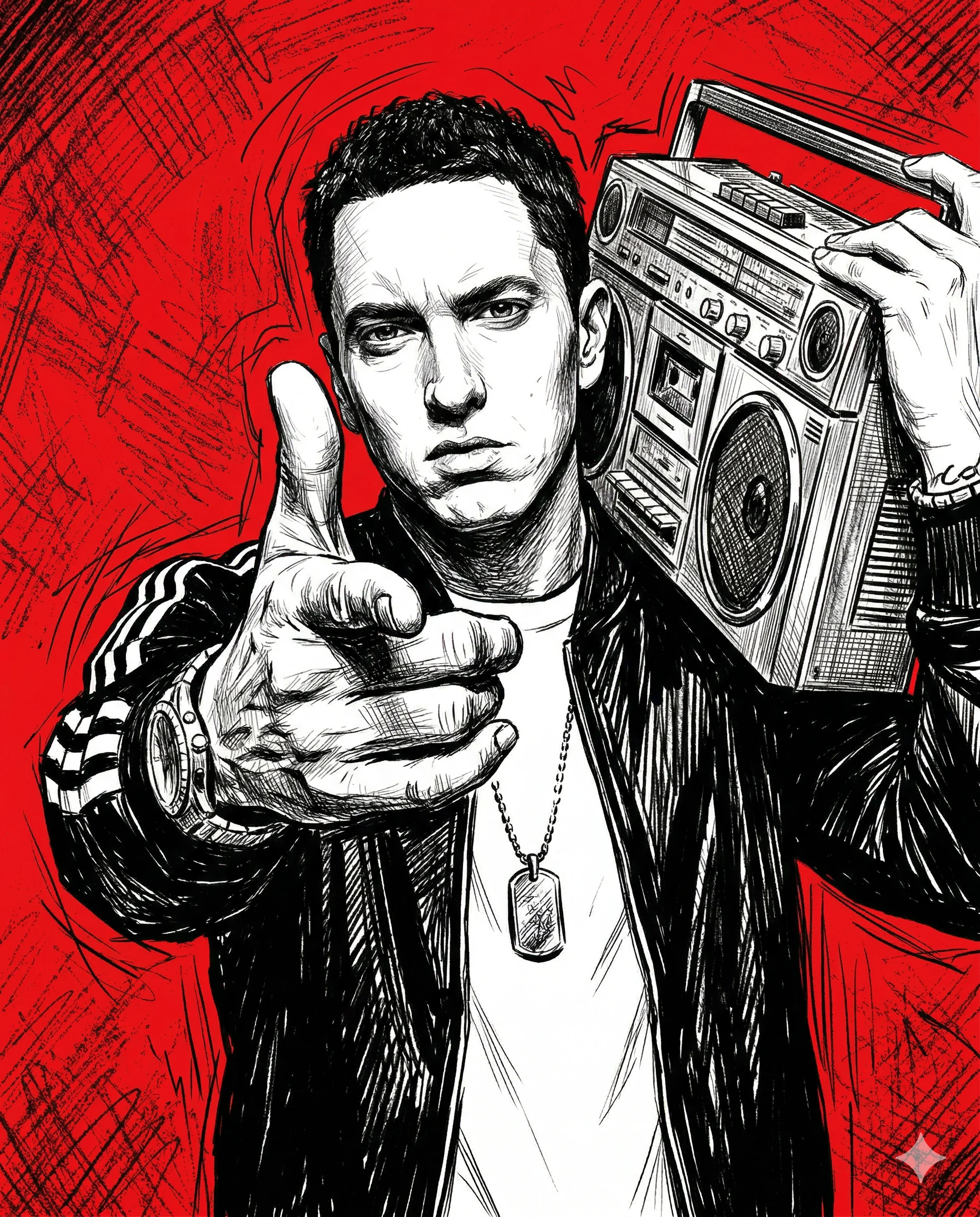 Create a high-quality 4:5 vertical digital illustration based on the provided reference image, transforming the real subject into a bold, gritty, hand-drawn sketch artwork with a powerful street-hip-hop attitude. Face Match & Identity Accuracy (Critical): Use the uploaded reference image as the only identity source. Preserve the subject’s facial identity with very high accuracy — exact face shape, forehead, cheekbones, jawline, eyes, nose, lips, skin structure, and overall likeness. The face should naturally adapt to this illustration style while still feeling unmistakably like the real person. Do not let it look like a bad Photoshop edit, pasted face, face swap, or low-quality AI blend. The identity integration must feel seamless, natural, and premium. Pose & Framing: Medium-full / upper-body dominant composition with the subject filling most of the frame in a dramatic, slightly low-angle perspective. The head is slightly tilted downward and subtly angled, giving a direct, dominant, confrontational presence. The subject looks straight toward the viewer with a strong attitude. Expression & Vibe: Stoic, intense, confident expression with a slightly furrowed brow and a serious, unapologetic rap-icon energy. The final image must feel bold, rebellious, stylish, and full of attitude. Hand Pose (Important): The subject’s right hand is thrust forward toward the camera in a finger-gun / pointing gesture, using strong forced perspective so the hand appears oversized and closer than the face. The fingers should feel aggressive, dynamic, and natural — not stiff. The hand must be one of the strongest focal points in the image. Other Arm & Prop: The subject’s left hand supports a large vintage boombox resting on the left shoulder. The boombox should feel heavy, iconic, and detailed, with visible speakers, knobs, cassette/radio sections, and metallic texture. Clothing & Accessories: Black or very dark Adidas-style track jacket with visible zipper folds and sporty streetwear character Cool-white inner shirt Metallic dog-tag chain necklace with realistic pendant shape and chain fall Bracelet / wrist accessory details A large watch on the forward hand wrist must be clearly visible and well rendered Optional subtle tattoo details on wrist/forearm if present in reference Color Treatment(Critical): Use a minimal high-impact palette: Background: saturated vivid red Linework / jacket / shadows: deep black ink Skin tone: white Other light areas like shirt, boombox highlights, reflections, and accessories: cool white, not cream Art Style: Raw, energetic graphic novel / sketchbook / urban street-art illustration. Use: aggressive black ink drawing heavy cross-hatching scribble shading rough but controlled linework highly textured rendering The drawing should feel premium and intentional, not messy in a cheap way. Lighting: Strong high-contrast chiaroscuro lighting with bold highlights and deep inked shadows. The face, hand, and boombox should have dramatic depth created through sketch lines and tonal contrast. Background: A solid bright red backdrop with chaotic black scribble textures, especially concentrated around the head and upper body like an energy aura. The scribbles should add motion, rawness, and aggression without distracting from the subject. Quality Control: The final image must look like a polished, premium illustration conversion — not a cheap edit, not low-resolution, not over-processed, not a pasted face, and not fake-looking Photoshop work. The face should blend perfectly with the illustrated anatomy, perspective, and style. Overall Result: A striking, high-energy, attitude-heavy portrait illustration with strong forced perspective, clean identity preservation, and iconic hip-hop poster vibes.