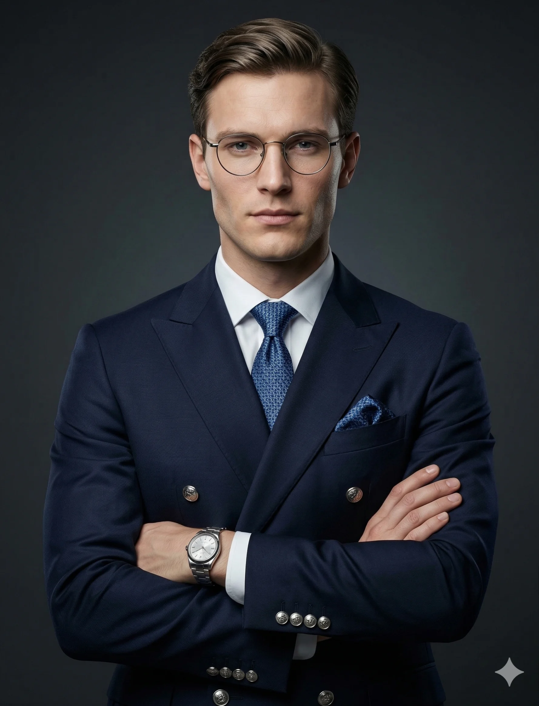 Create a ultra–realistic professional studio portrait of a confident man standing with his arms crossed, facing the camera directly. The subject is wearing an elegant dark navy blue double-breasted suit with shiny metallic buttons, paired with a clean white formal dress shirt and a stylish patterned blue tie. A matching blue pocket square is neatly placed in the blazer pocket, adding a classy touch. The subject is also wearing round thin-frame eyeglasses that give an intelligent and professional appearance. A luxury silver wristwatch is visible on the wrist, adding a premium and sophisticated detail. The hairstyle is short, neat, and well-groomed, with a clean and polished look. Pose: The man is standing straight with arms crossed confidently, shoulders relaxed, looking directly into the camera with a calm, confident facial expression. Lighting: Professional studio lighting, soft key light from the front with subtle rim lighting to highlight the edges of the suit and face, creating depth and a premium portrait look. Background: Dark gradient studio background (black to deep gray) that keeps the focus on the subject and enhances the cinematic portrait style. Camera & Style: Ultra realistic 85mm portrait lens sharp focus on face shallow depth of field cinematic lighting high detail skin texture premium editorial fashion photography style 8K resolution HDR quality